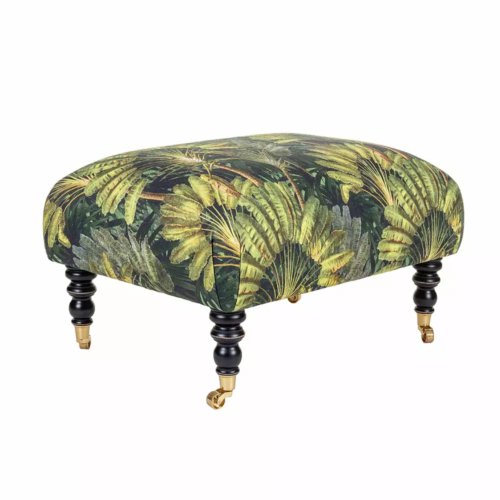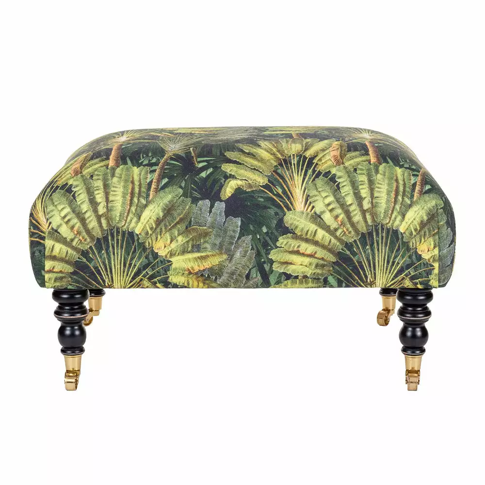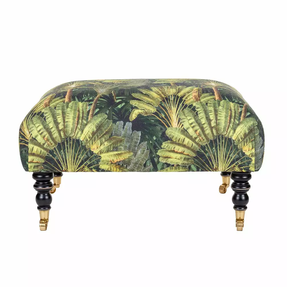 Mind the Gap’s collection of whimsical fabrics continues into this eclectic offering of furniture. This piece of art stool with a cushioned seat and beautiful turned legs, upholstered in our Traveller’s Palm linen as seen in the picture, but you can choose from the full range of Mind The Gaps fabrics. Sited on short turned legs with gold castors. Rich tones of greens and brown highlights. Perfect for the tropical Havana Tropicana look.    Â