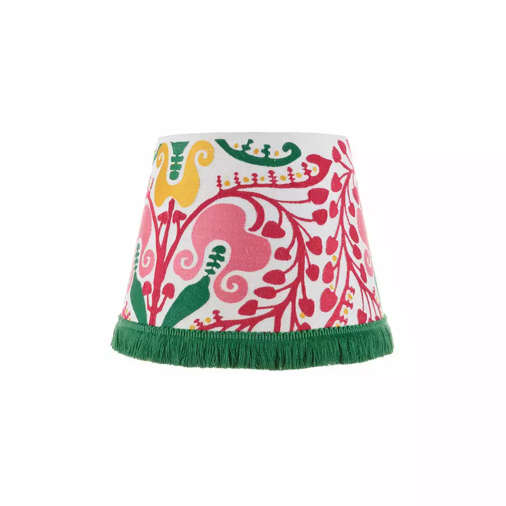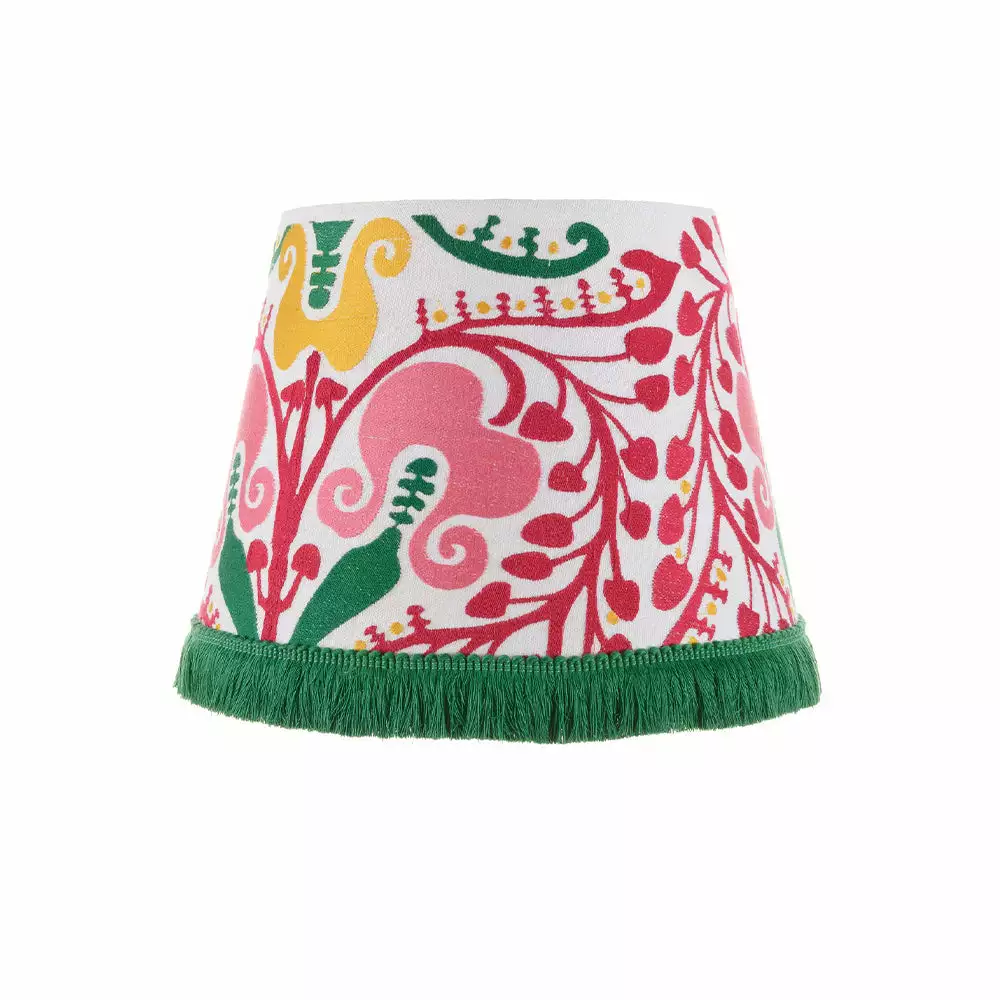 Flares of flower details and bursts of colours depicting a stunning Hungarian folk pattern in this embroidered lampshade. Finished with green cotton fringes, the lampshade is fitted with reversible gimbal and white fabric lining. Part of the Transylvanian Roots collection. Folk Couture at it’s finest.