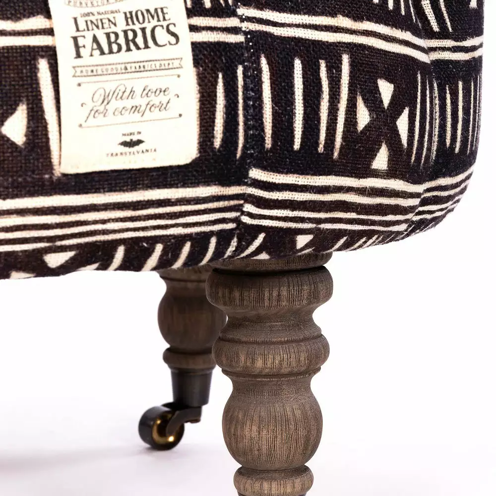 Mind the Gap’s collection of whimsical fabrics continues into this eclectic offering of furniture. BOGOLANFINI linen adorns this tufted stool as a perfect pair to the LOUIS chair. Buttoned tufted seat and elegant turned legs. Graphic and bold in black and white print – vintage wooden legs with castors. Â