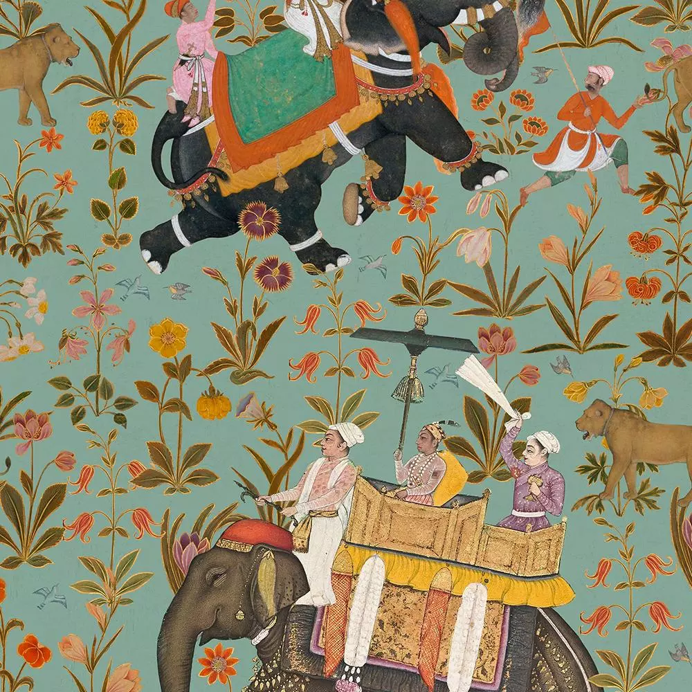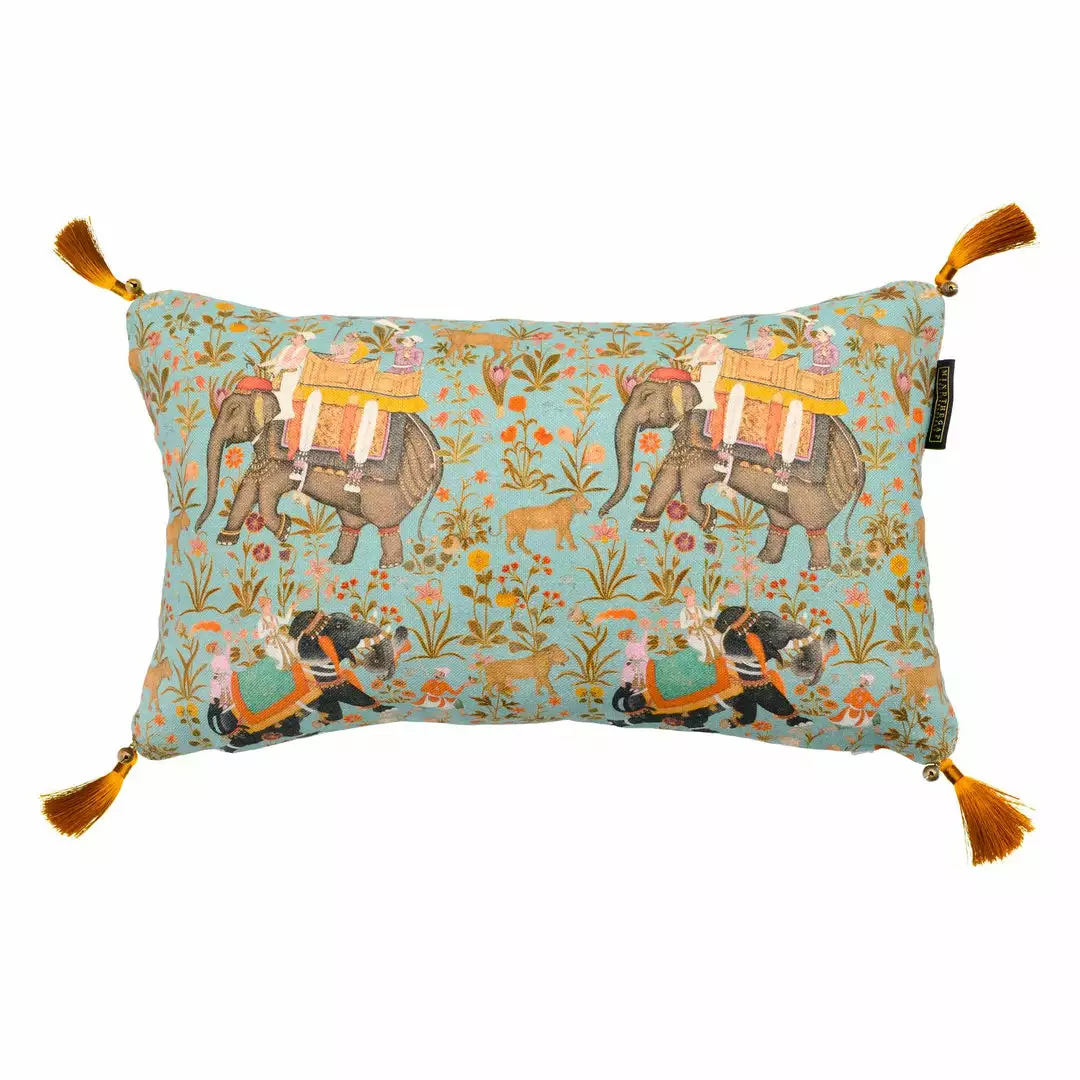 A beautiful aquamarine base with black and brown Elephants , a sacred animal of the Hindu culture. Roaming lions and large florals in pink, yellow and red. Natural linen finished with assorted piping, tassels and 100% duck feather filling. Â