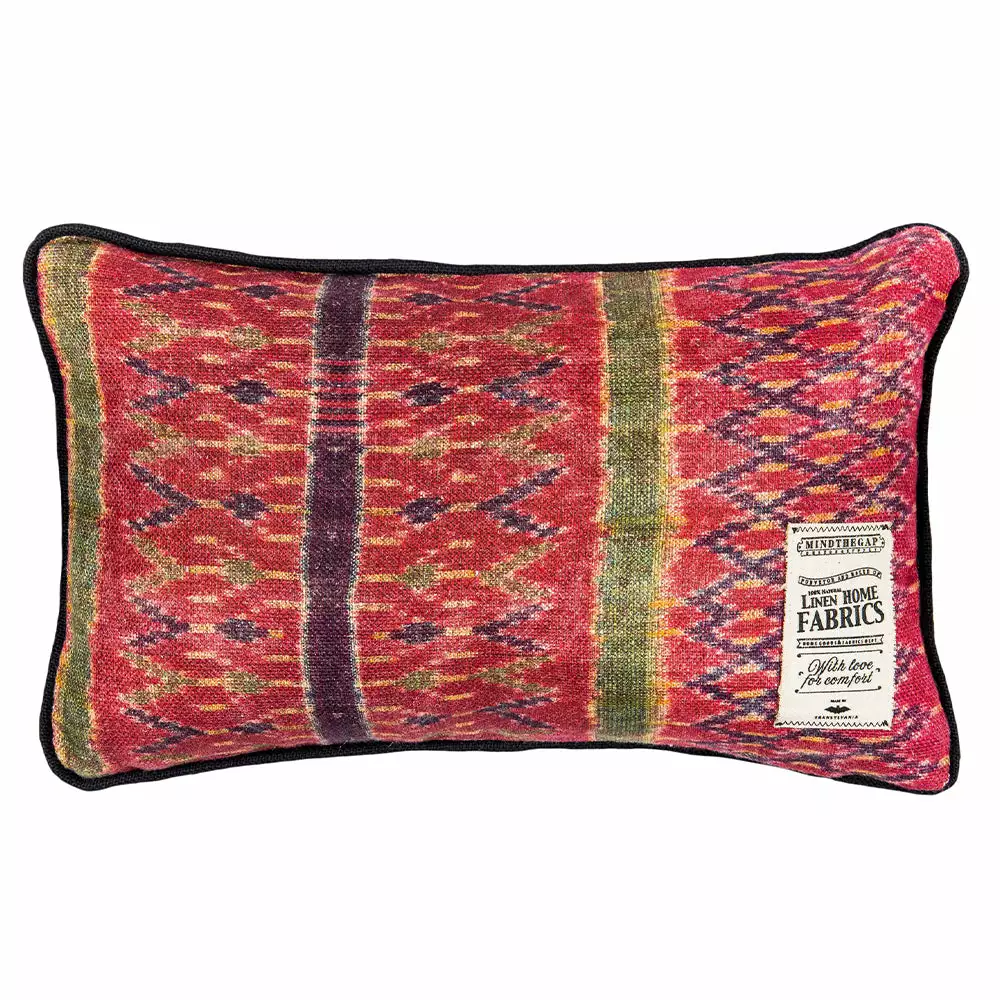 A beautiful handwoven pattern originally made by the nomadic people of Central Asia. Berry tones with green and purple-blue weave. Stonewashed linen finished with assorted piping and 100% duck feather filling.  Â