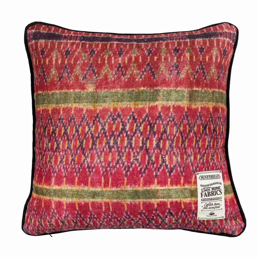 A beautiful handwoven pattern originally made by the nomadic people of Central Asia. Berry tones with green and purple-blue weave. Stonewashed linen finished with assorted piping and 100% duck feather filling.  Â
