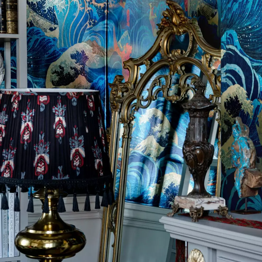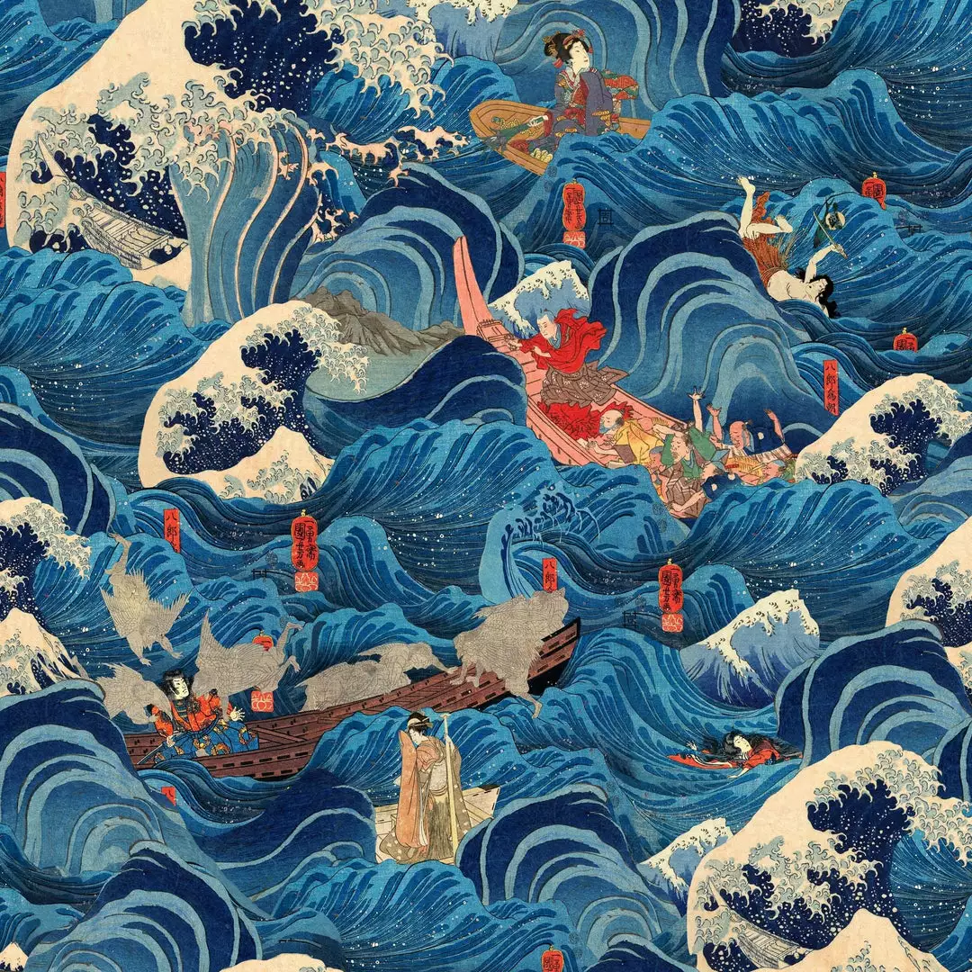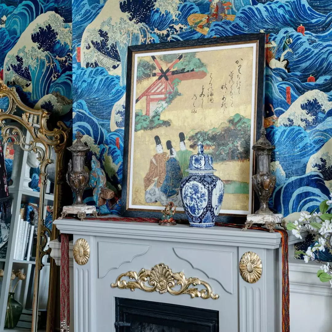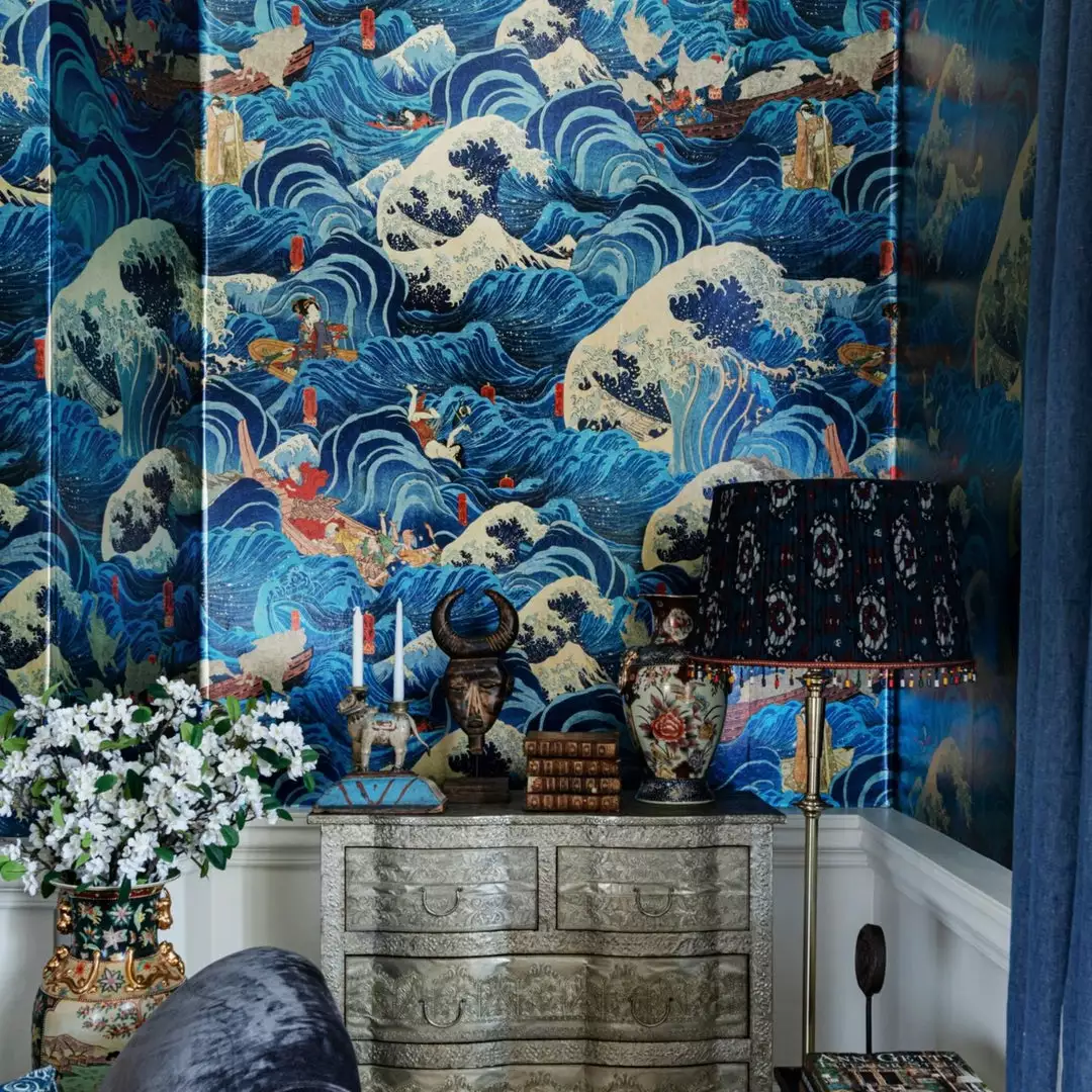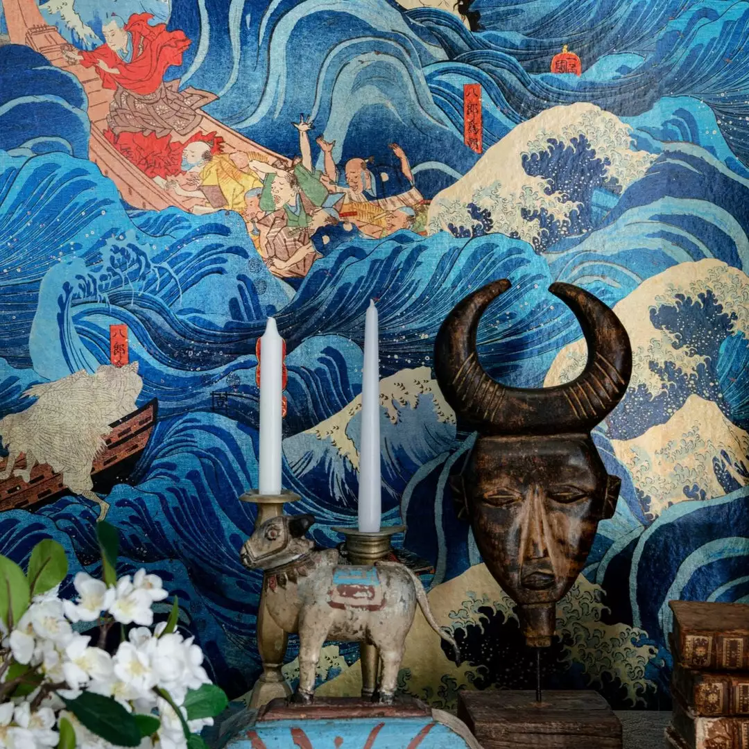 Adorn your walls with The Former Emperor wallpaper from Mind The Gap. Influenced by the Japanese woodblock prints, watch the small wooden boats navigate the storm as the large waves crash down around them. Each bright blue wave is decorated with metallic details, adding fluidity and elegance to the design. A vibrant, decorative statement perfect for livening up any home. Easy to put up with the paste the wall application and will add a bit of quirk to any room whether it is one wall or all. This wallpaper is digitally printed using eco-friendly inks. Printed across three rolls to maximise the pattern repeat.Â