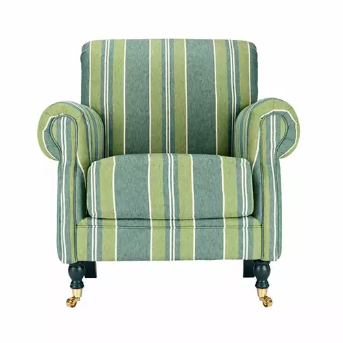 An elegant and very comfortable chair with slightly sloping back, large rollover arms and a fluffy comfortable seat. Finished with beautiful vintage style castor gold front legs. Shown here in Szekely stripe print of greens on a linen base. Armenian in origin.