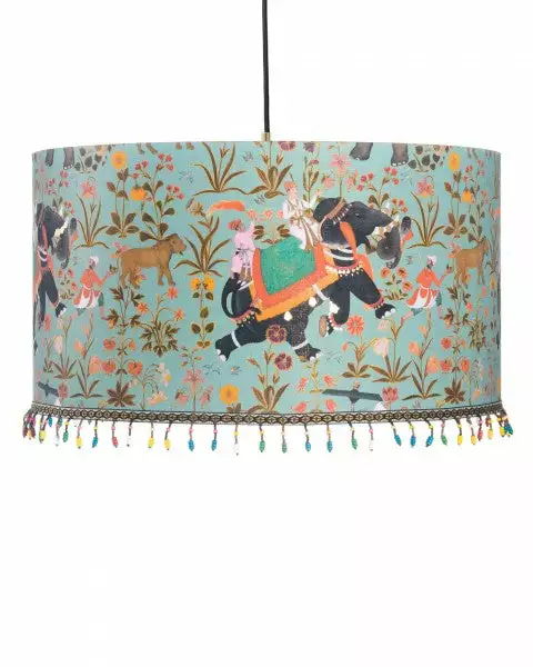 A fun and whimsical print, a sacred Elephants, lions and blooms dance against the beautiful aquamarine backdrop. Colourful pops of brightness light up the sky with a metallic gold lining. Finished with braided lace ribbon and multicoloured beads.