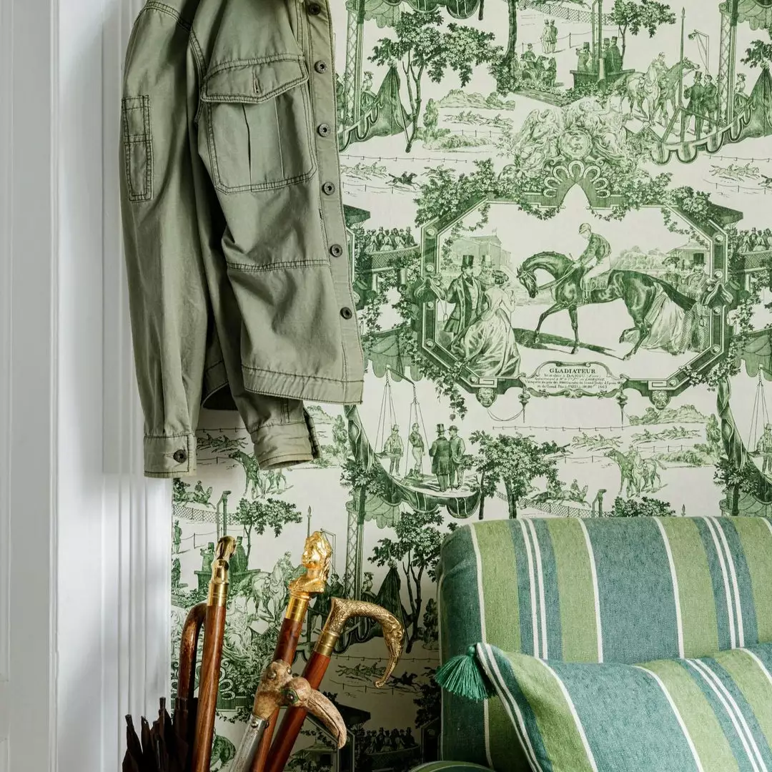 Surround yourself with the beautiful Grand Prix wallpaper from Mind The Gap. Influenced by the French Toile de Jouy patterns, this design depicts a day at the race course. Find delicate and intricate details, all hand illustrated to achieve a special and impactful statement for any interior, both traditional and contemporary. Available in both green and smokey red. Easy to put up with the paste the wall application and will add a bit of quirk to any room whether it is one wall or all. This wallpaper is digitally printed using eco-friendly inks.Â
