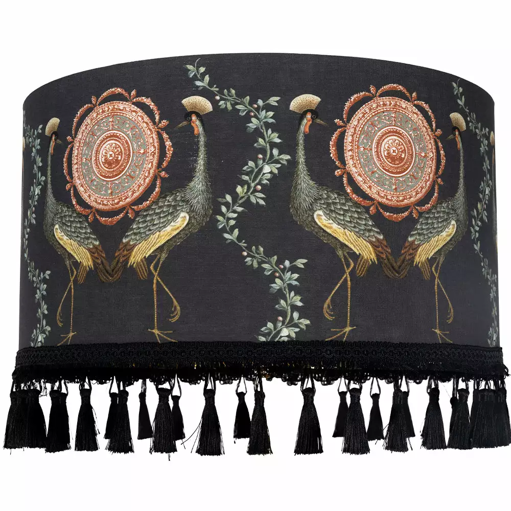 A elegant lampshade with profiles of large scale birds and a beautiful royal rosette ornament. A black base with green and rust illustration, finished with gold lining and black tasseled fringes. A true statement item.
