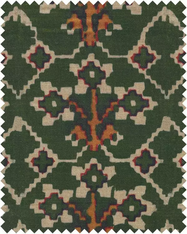 An Eloquent Hungarian colour palette. Geometric flower pattern. Soft shapes against this noble dark green heavy linenÂ