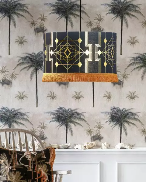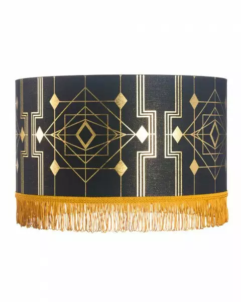 Iconic in it’s ART DECO pattern this shade is highlighted with gold foil accents. Gold metallic lining and gold looped fringes add to the richness. Gatsby approved.
