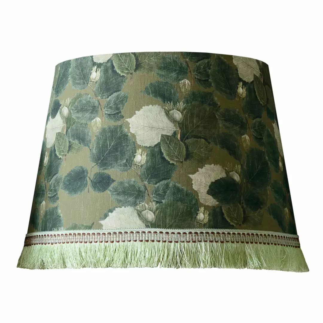Inspired by wild flowers growing in the garden of the manor, a rich green foliage creates a backdrop for the purist of white blooms. Finished with white fabric lining and a soft green fringe. Â Â