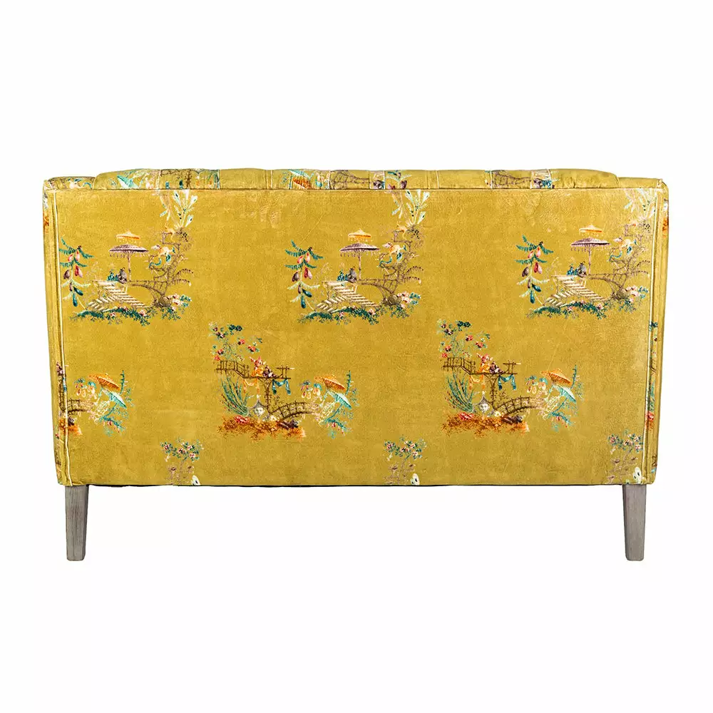 Mind the Gap’s collection of whimsical fabrics continues into this eclectic offering of furniture. CHINOISERIE velvet adorns this classic, two seater French style sofa . A delicate print on plush cotton velvet with luxurious buttoned tufted back, crescent arms and distressed turned legs. Exotic yet subtle and lush in colours of yellow with green, taupe, blue and brown – grey contrast legs  Â