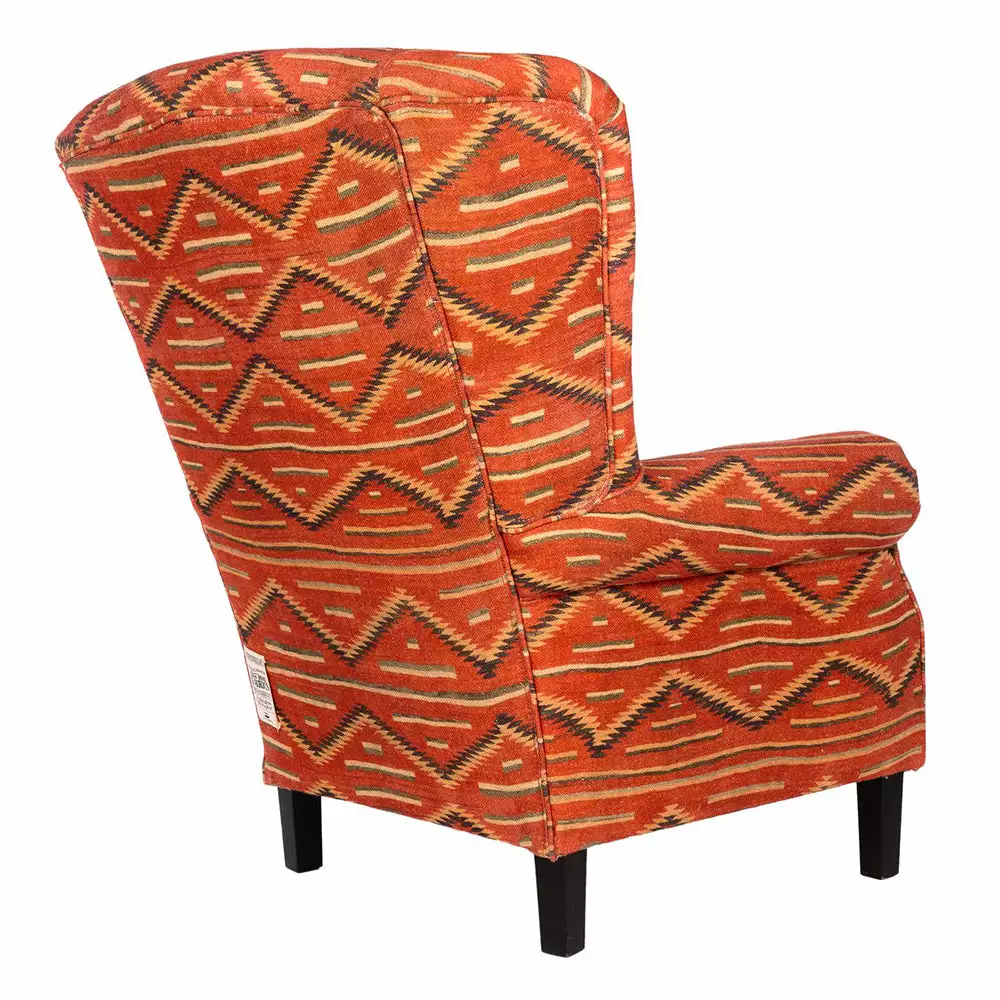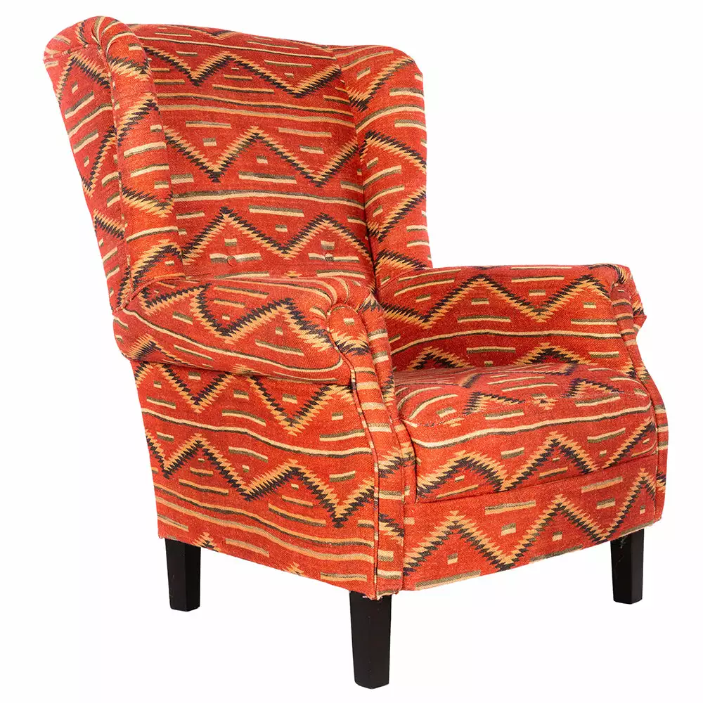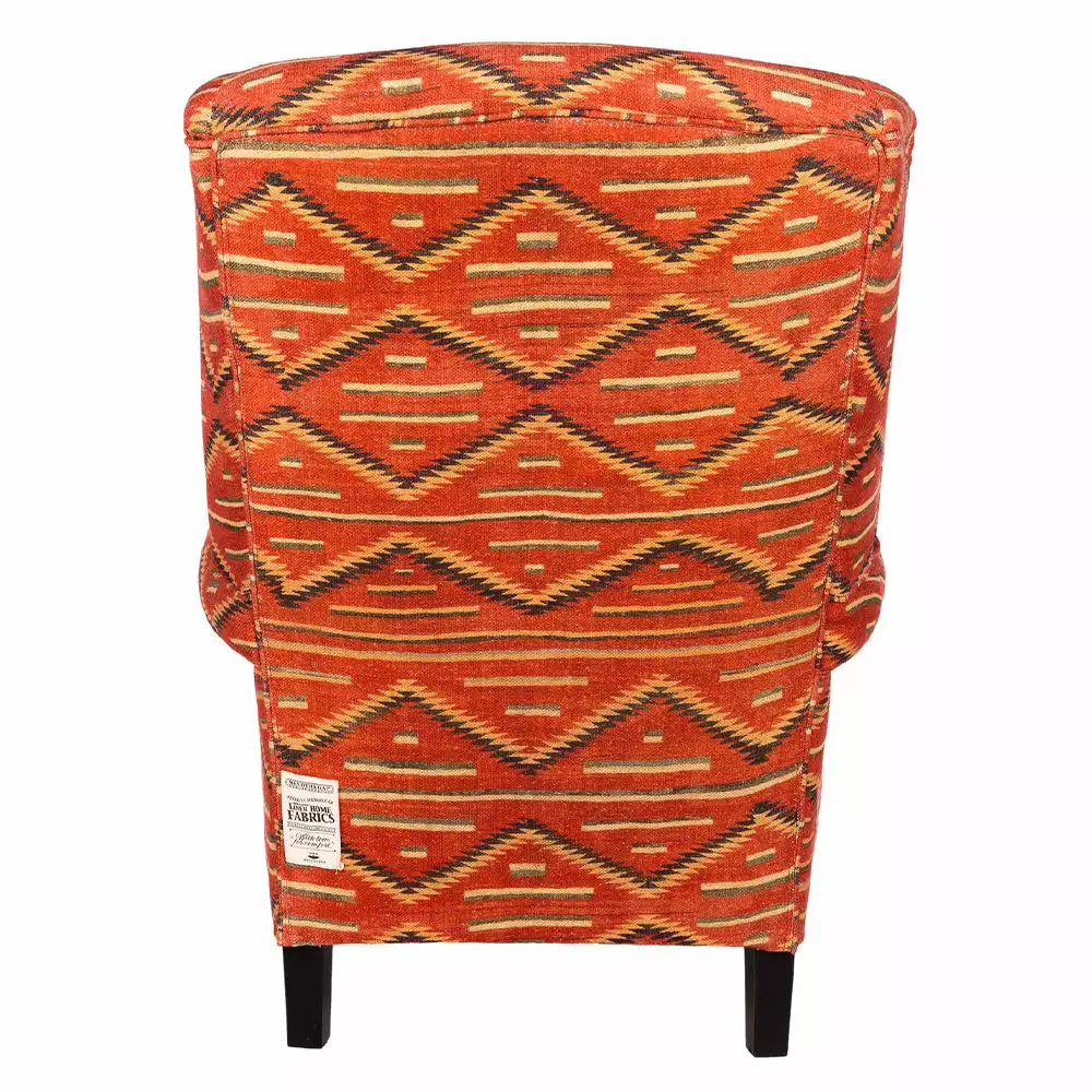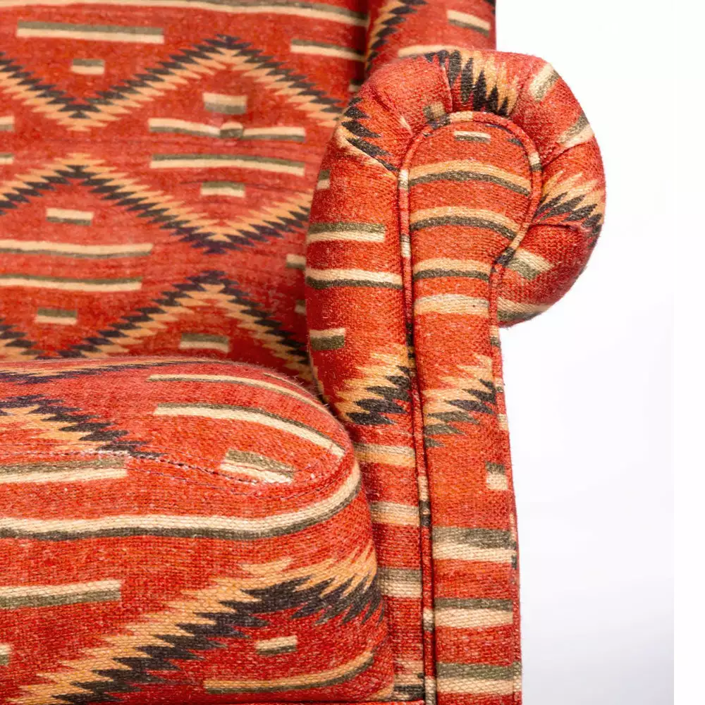 Mind the Gap’s collection of whimsical fabrics continues into this eclectic offering of furniture. Here the classic armchair silhouette is updated with EYEDAZZLER NAVAJO linen from our INDIGENA collection . A strong traditional pattern with nods to the Navajo weave traditions. Tones of black ,red and yellow. A perfect accent for the modern farmhouse. Â Â