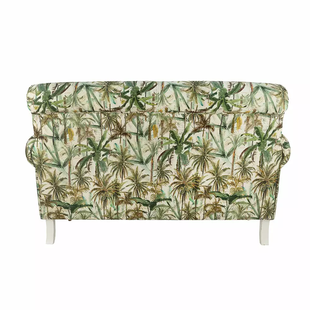 Mind the Gap’s collection of whimsical fabrics continues into this eclectic offering of furniture. This opulent and chic style two seater sofa in JUNGLE LINEN from our HAVANA TROPICANA collection. High upright back , comfortable seat and rollover arms seated on turned castor gold front legs. A noble Scottish house of traditional style merged with modern high-end looks.Â