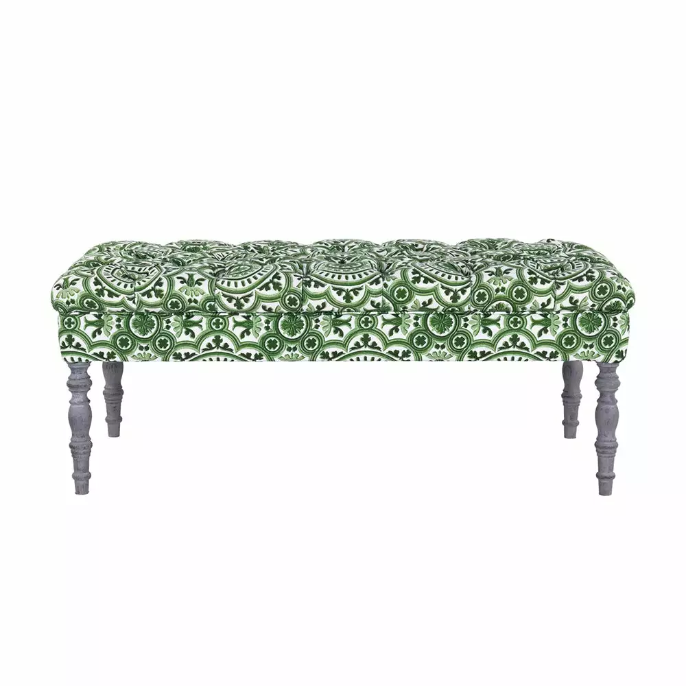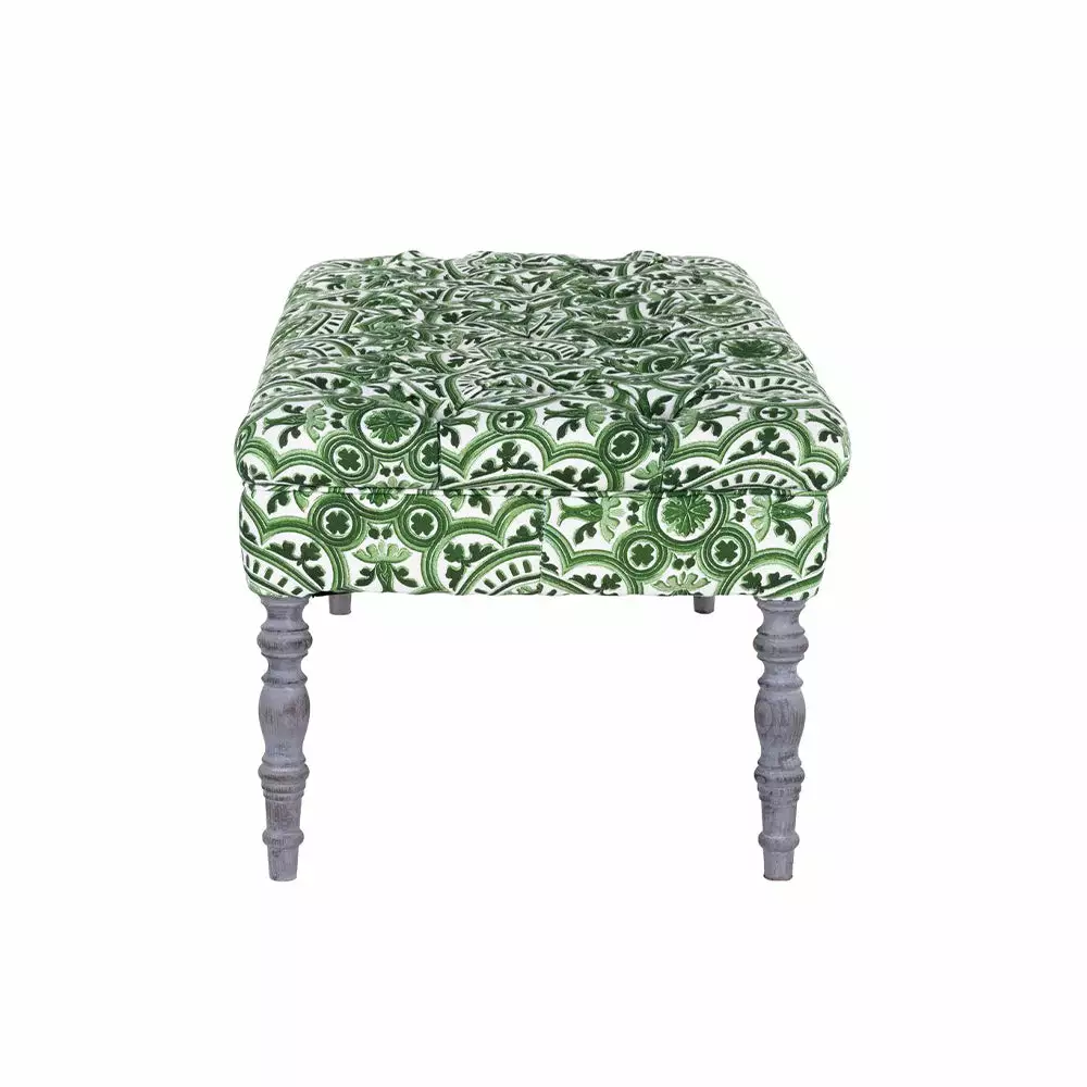 Mind the Gap’s collection of whimsical fabrics continues into this eclectic offering of furniture. The MANOR linen fabric adorns this classic styled bench ottoman. A strong print of fresh greens and clean white with luxurious buttoned tufted seat and distressed turned legs. A garden’s delight and a pop of freshness to any interior. Â Â