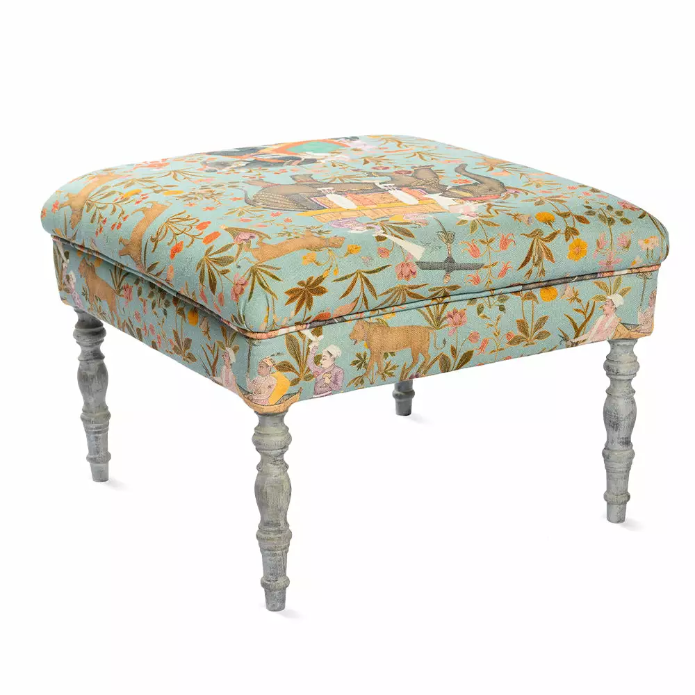 Mind the Gap’s collection of whimsical fabrics continues into this eclectic offering of furniture. HINDUSTAN Aquamarine fabric adorns this classic styled ottoman – a marvelous and joyful pattern of spice and floral colours representing the beautiful world of Hindustan on a pale blue background.Â