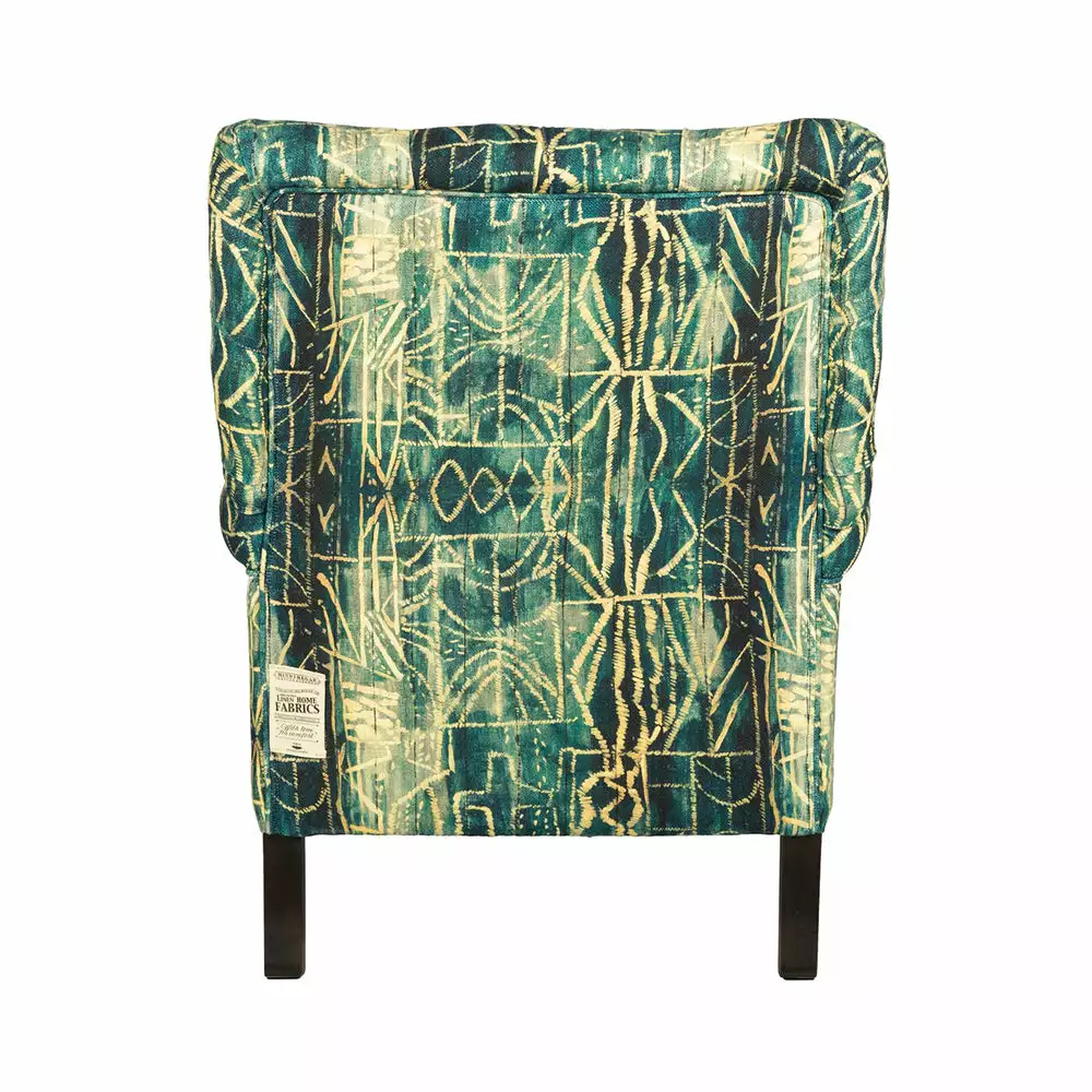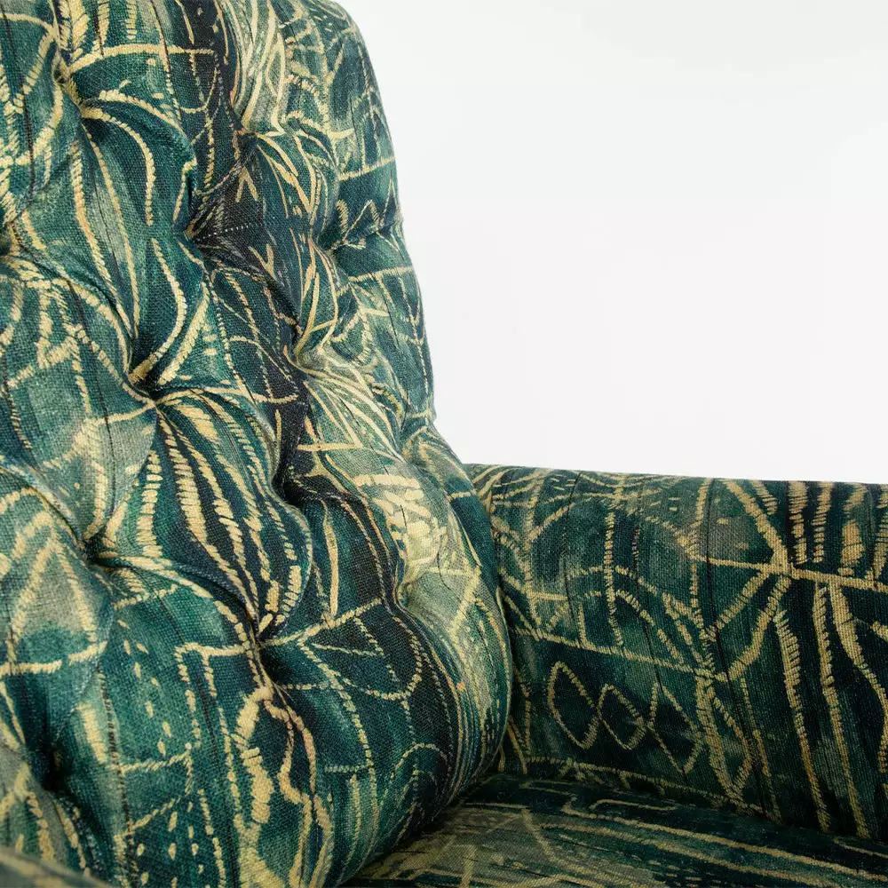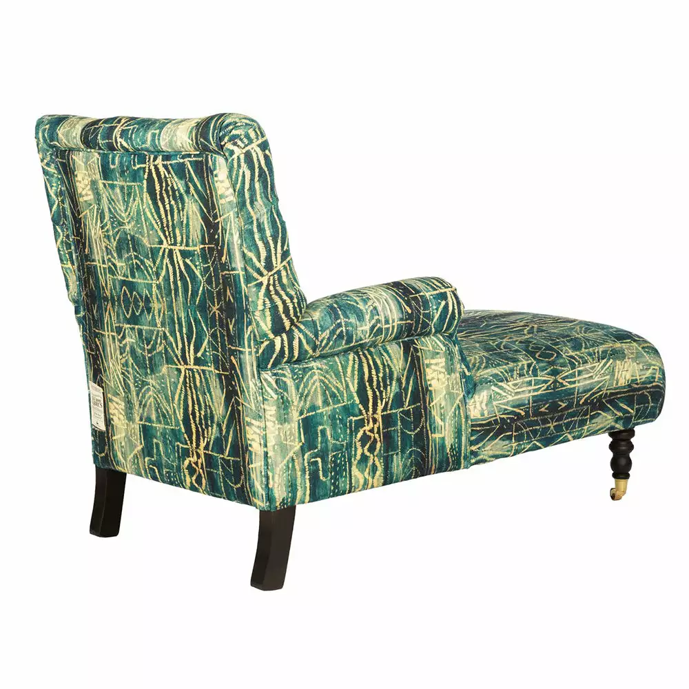 Mind the Gap’s collection of whimsical fabrics continues into this eclectic offering of furniture. This statement chaise features rollover arms and a sophisticated silhouette by the tufted backrest adding both elegance and function to your space. Crafted from beechwood and upholstered with a soft foam filling. Tapered grey washed legs and gold castors. BAMBILELE 100% linen in a rich cultural pattern, tones of Blue , Brown and yellow.Â