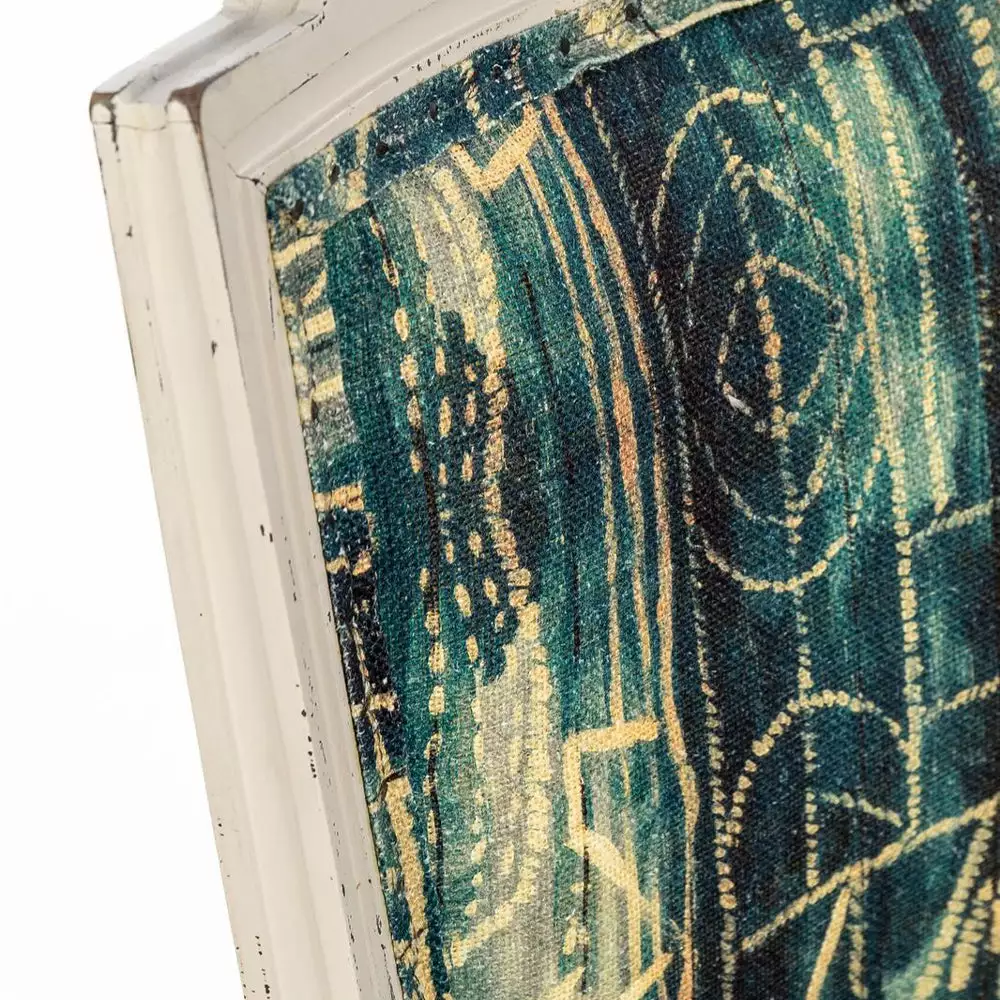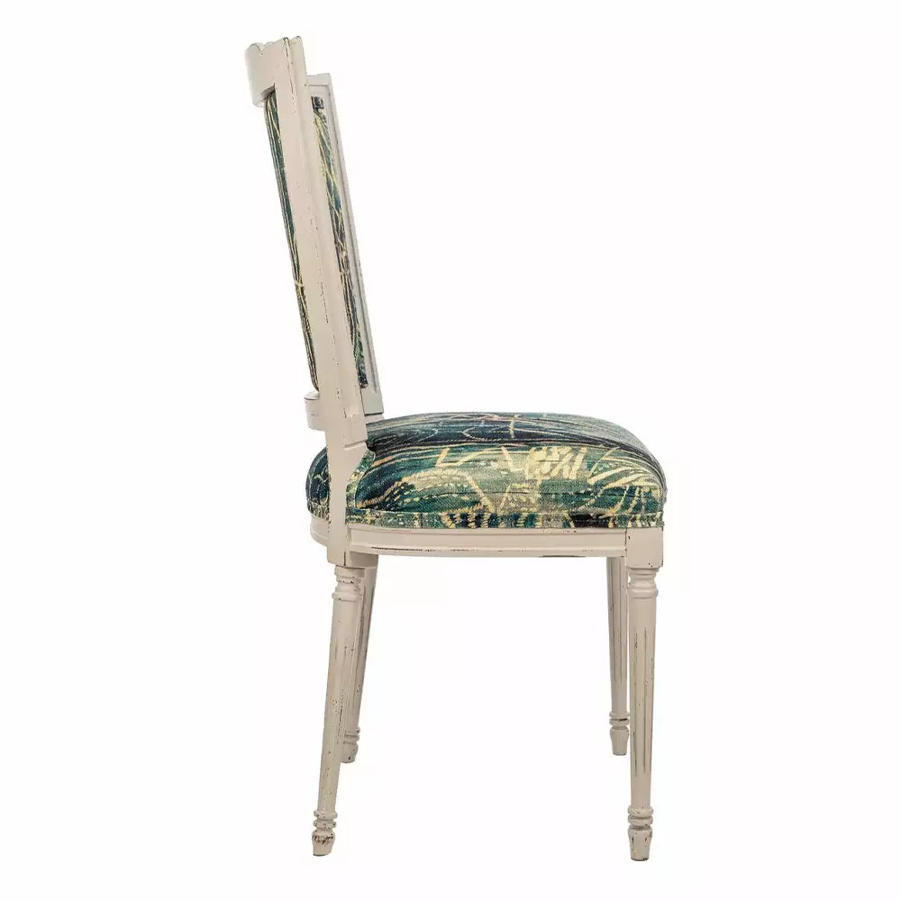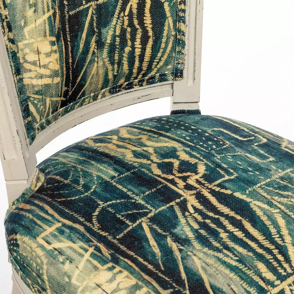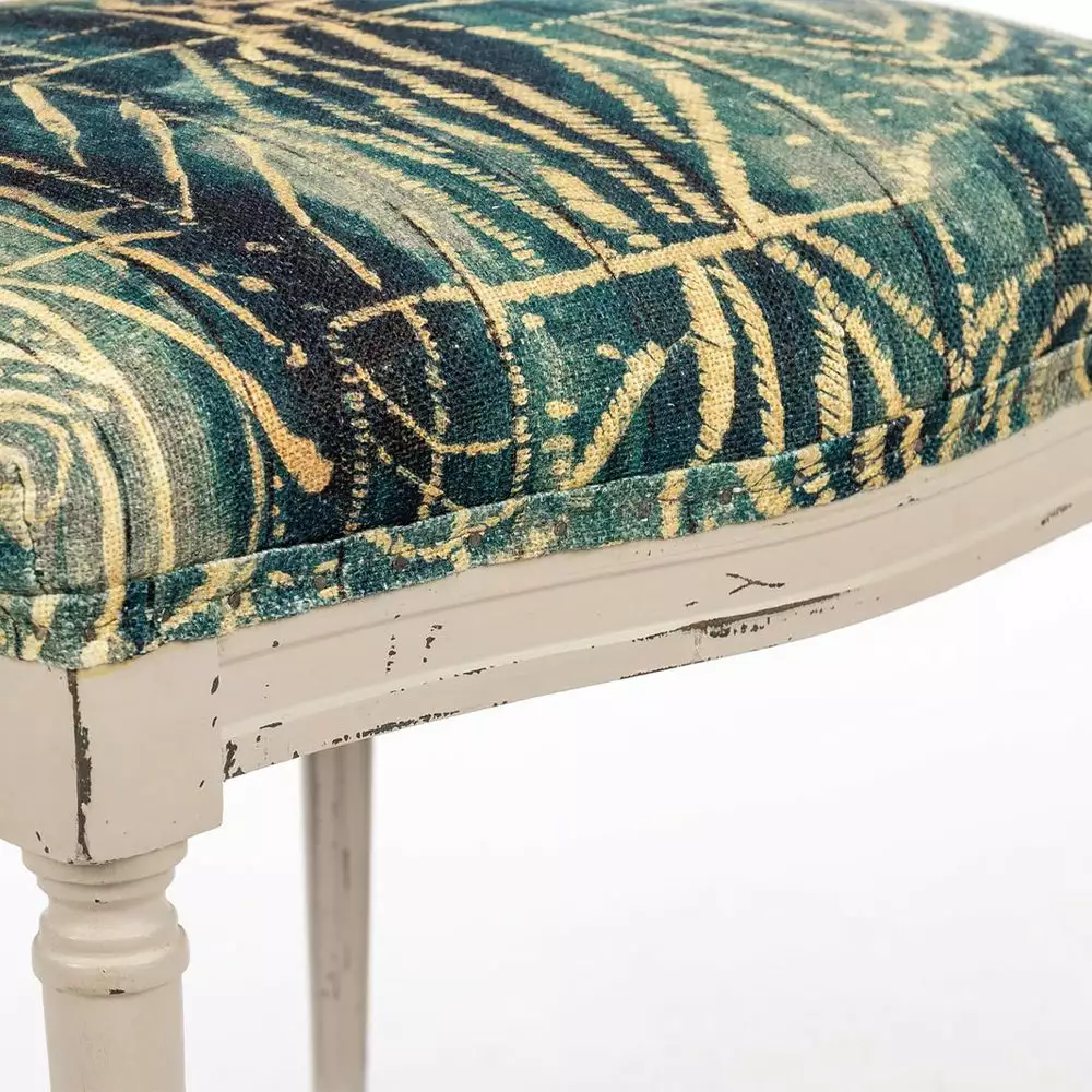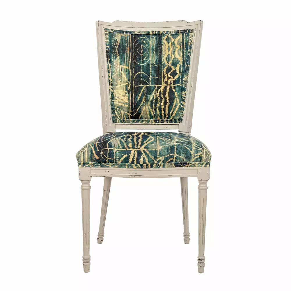 Mind the Gap’s collection of whimsical fabrics continues into this eclectic offering of furniture. A Neo-classic style dining chair upholstered in BAMILEKE Linen with it’s rich pattern of green , taupe and yellow . Shaped with a slightly curved back and pointed wing tips, finished with decorated turned legs in a distressed paint.Â