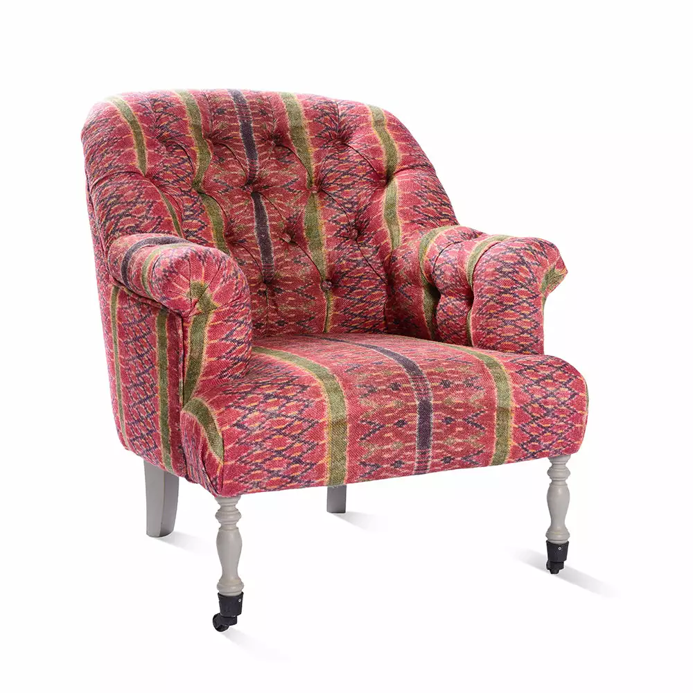 Mind the Gap’s collection of whimsical fabrics continues into this eclectic offering of furniture. Here the tufted armchair is updated with LAKAI from our INDIGENA fabric collection . A vintage style fabric with a handwoven pattern made by the ancient nomadic people…rich jewel tones of red, green , yellow and purple -blue.