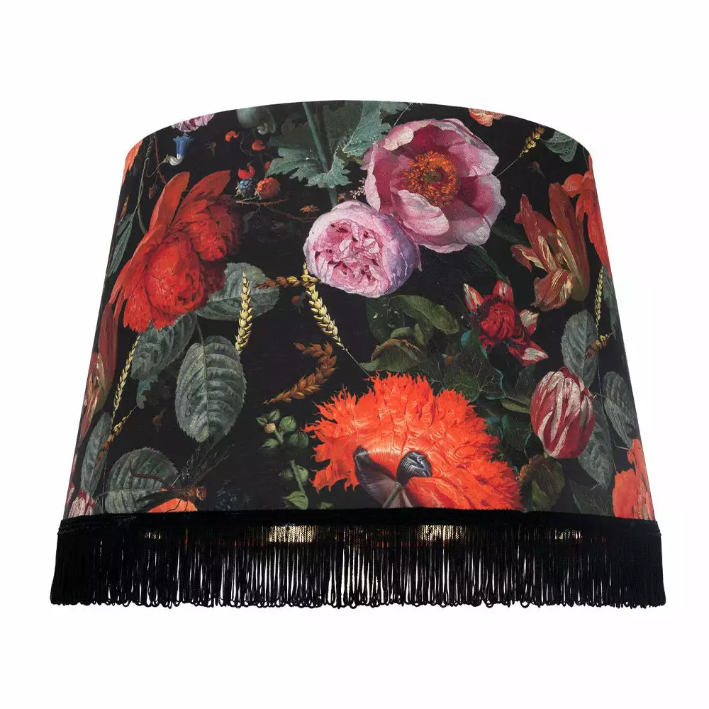 The opulence continues with gold lining and black looped style fringes. Available in three sizes for either Table or Floor lamps , and a further three sizes as Pendants.Â