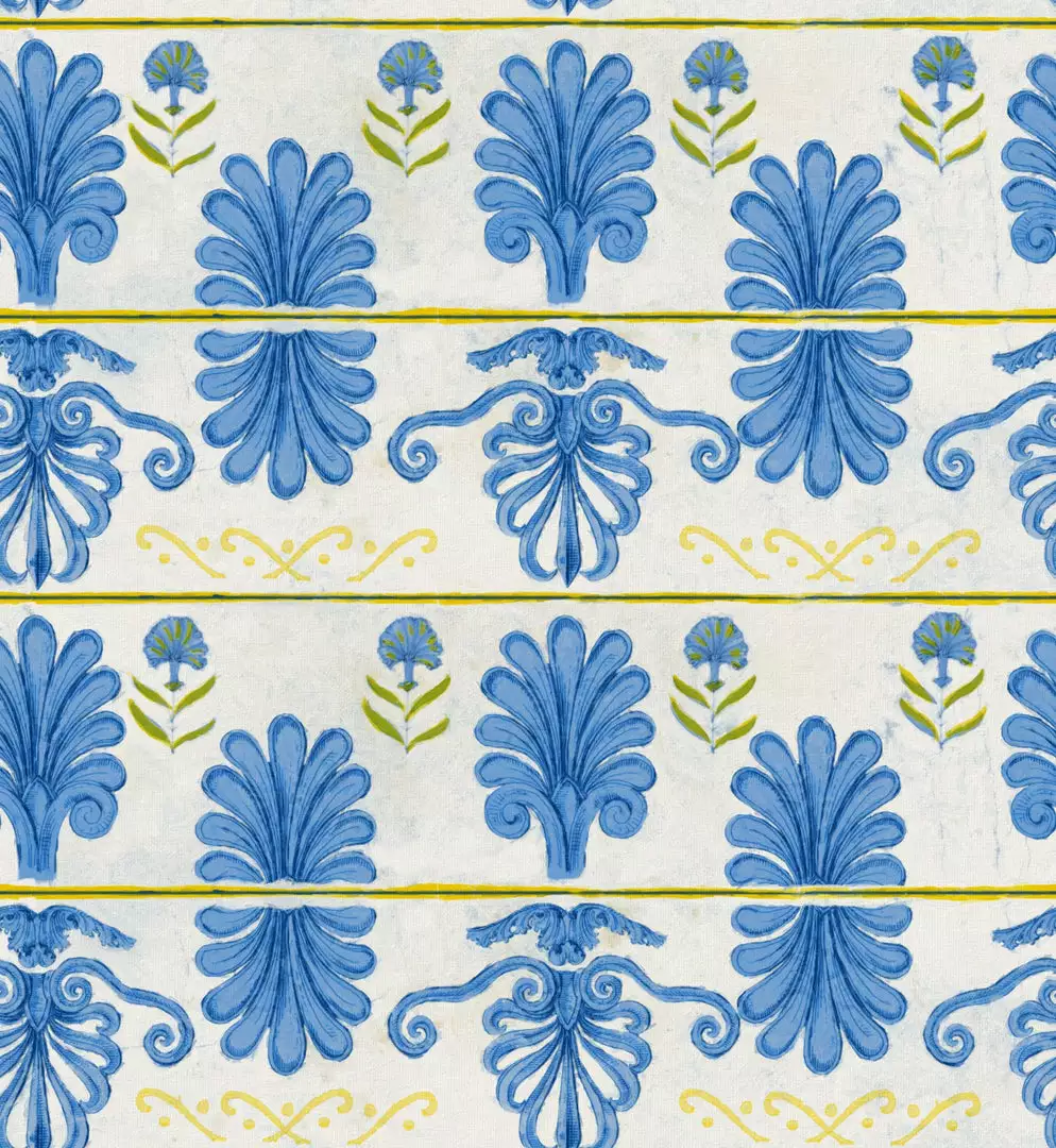 Fine ornaments showing decorative algae are highlighted in this delicate embellished pattern, creating a luxurious decorative wallpaper. Feel the warmth of a hot summer’s day wrapped within the walls of a splendid holiday villa. This complementary design is available in Island Green, Azure, Taupe, White Sand and Lemon.
