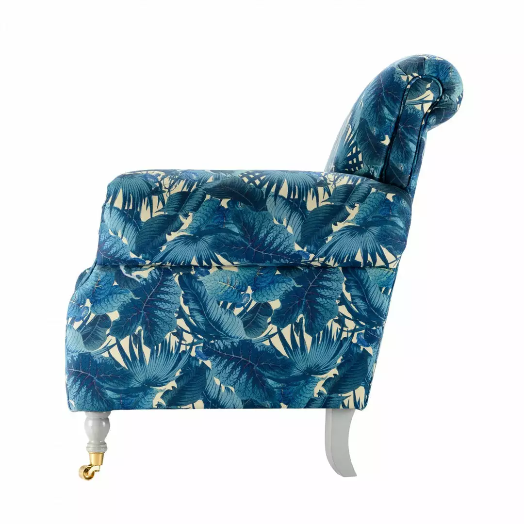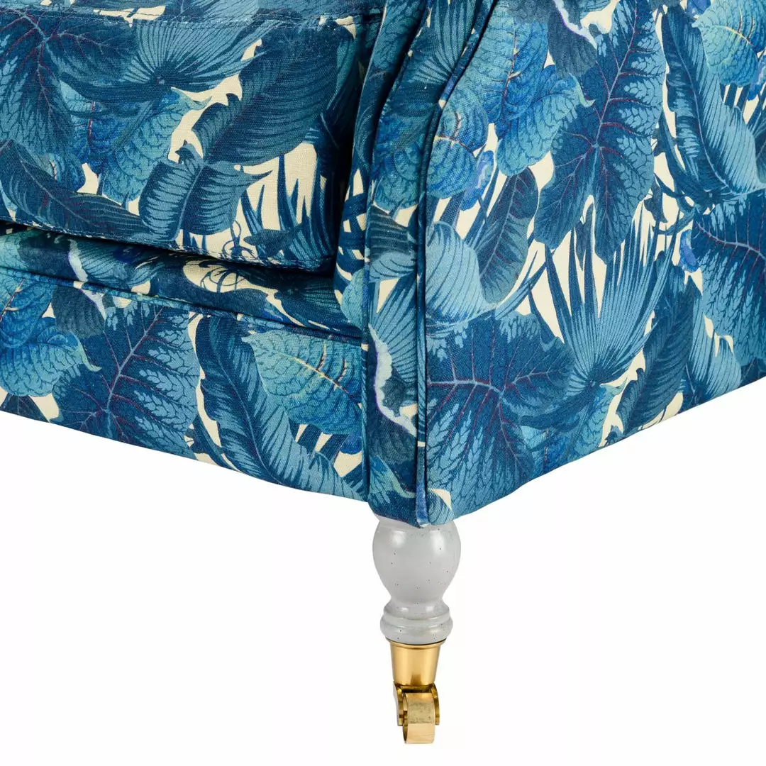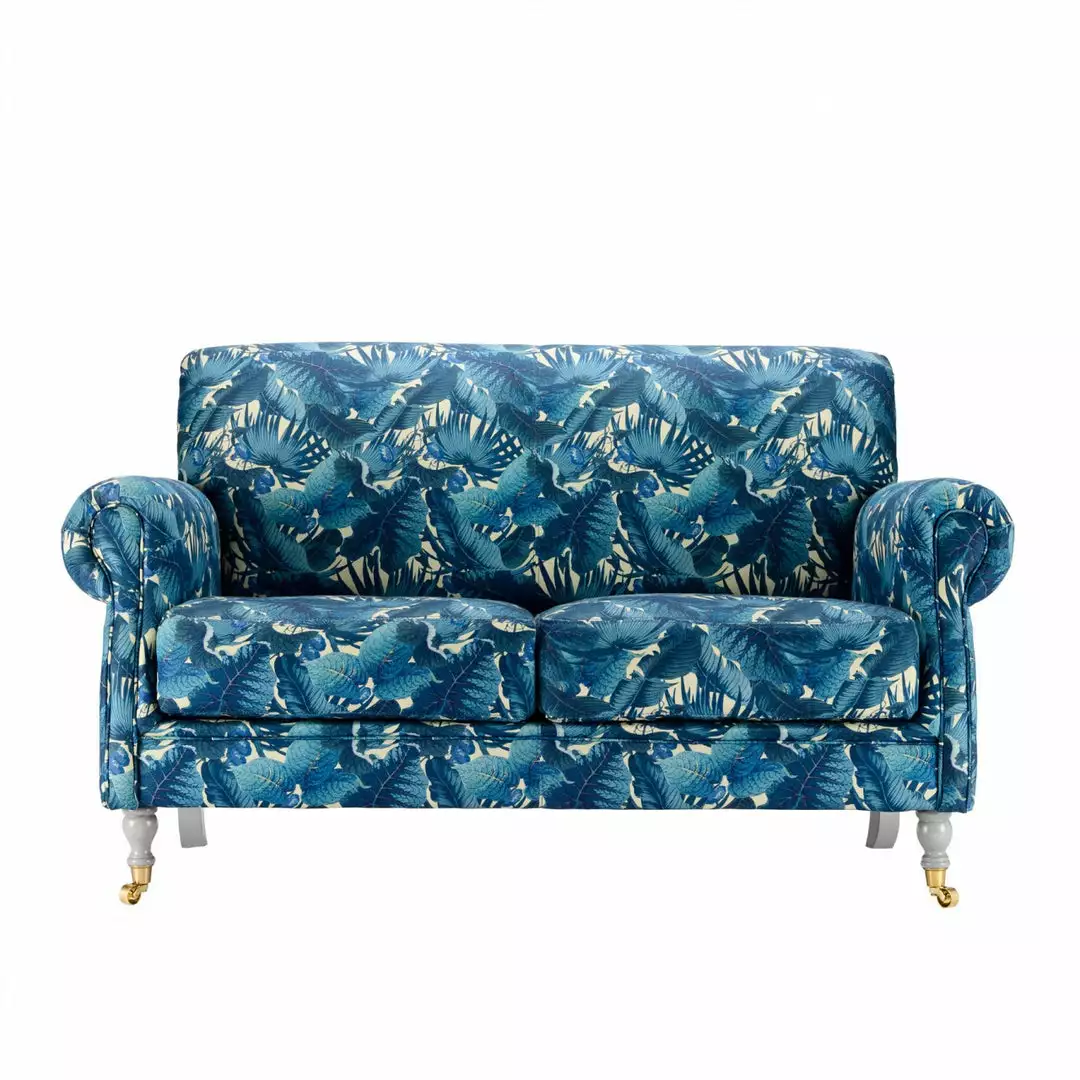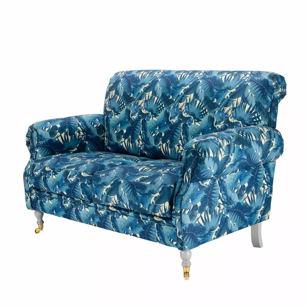 Mind the Gap’s collection of whimsical fabrics continues into this eclectic offering of furniture. This opulent and chic style two seater sofa in Paradeisos Linen. High upright back , comfortable seat and rollover arms seated on turned castor gold front legs. A noble Scottish house of traditional style merged with modern high-end looks.Â