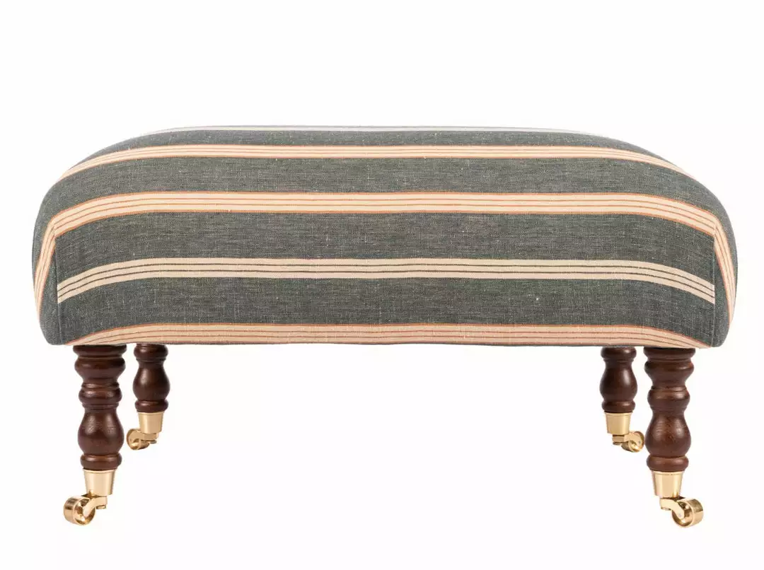 A piece-of-art ottoman with a cushioned seating, this HUDSON stool is dressed in OREGON STRIPES Washed Linen. The beautiful turned cherry brown legs are finished with gold castors.