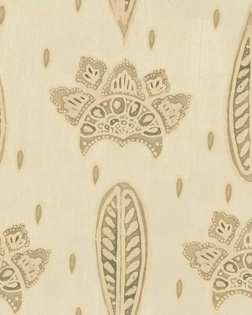 Dance through the tropical jungle to the beat of Javanese gongs and make a soundtrack from the rhythm of the rustling palms with BETHEL BATIK, a pattern showcasing the ancient Indonesian art of drawing and dying with hot wax. Decorated with traditional pod shapes and intricate crowns surrounded by delicate droplets, the gentle Antique White background brings the crafted nature of the unique forms into focus, its subtle shapes creating a calming neutral.