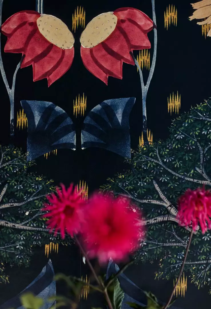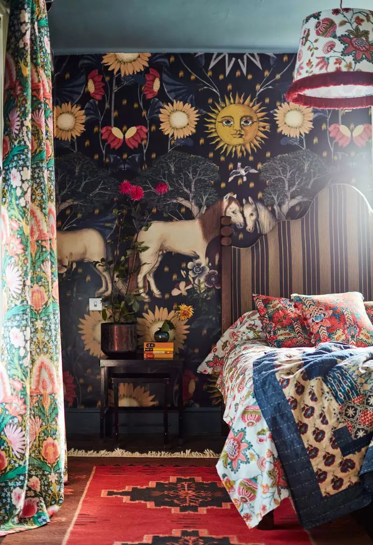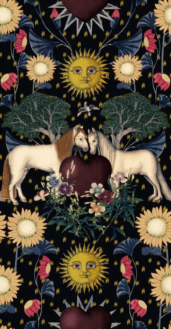 Meander through golden fields of sunflowers while wild horses graze under the shadow of woodland nearby. Symbolic hearts radiate a sense of comfort and peace as you lose yourself in the whimsical meadows which surround you with tranquility. The sun warms your skin as you listen to the sound of birds flying above you. Evoking sounds and smells of long summer afternoons, the MIRAGE wallpaper, set on two contrasting backdrops, brings a restful ambience into the room.Â
