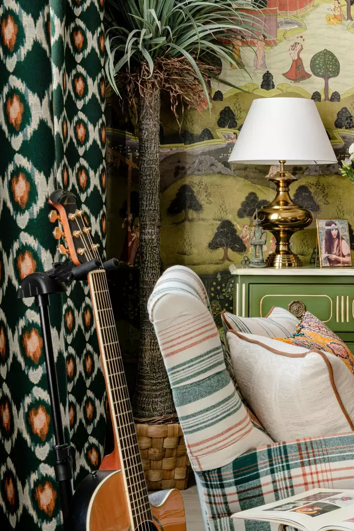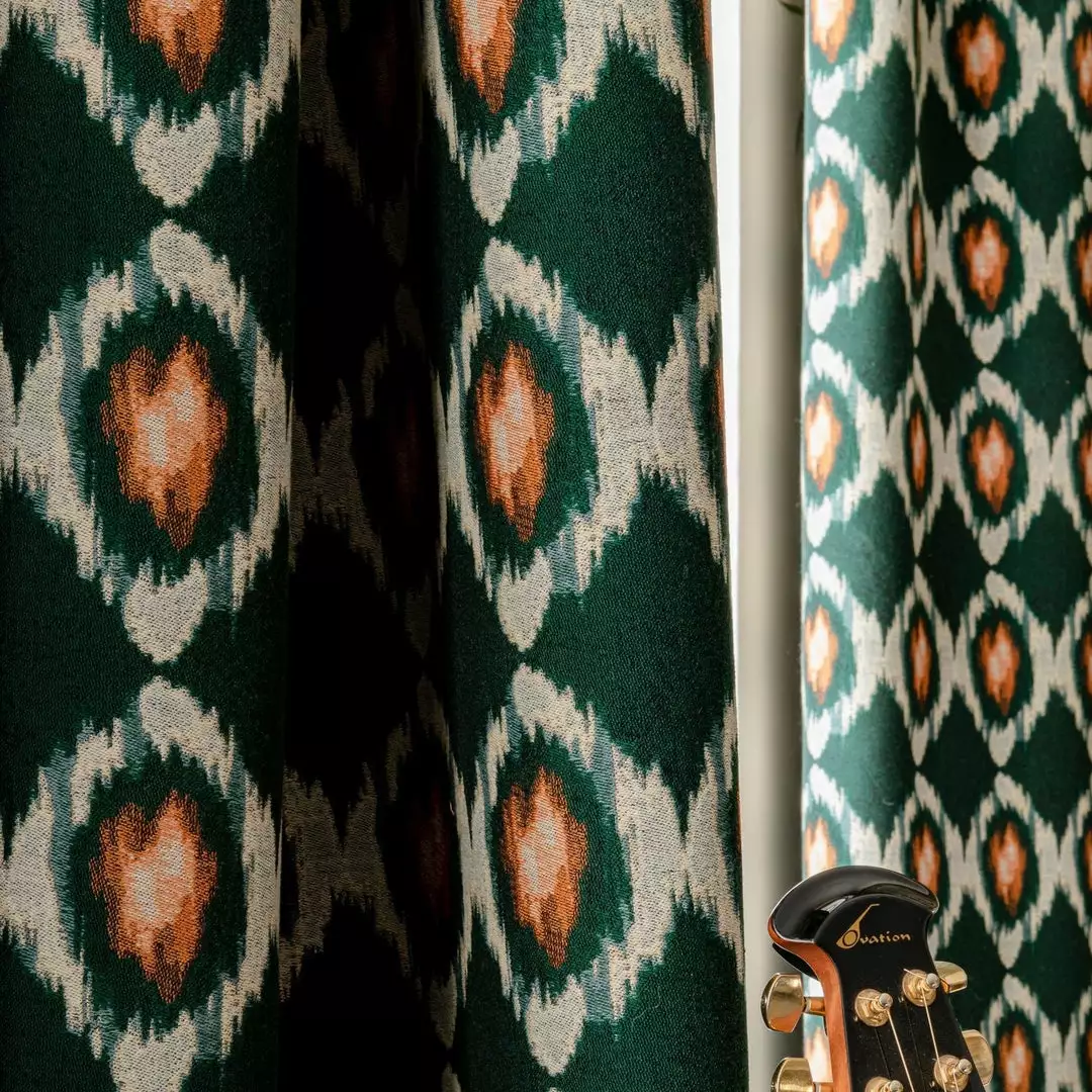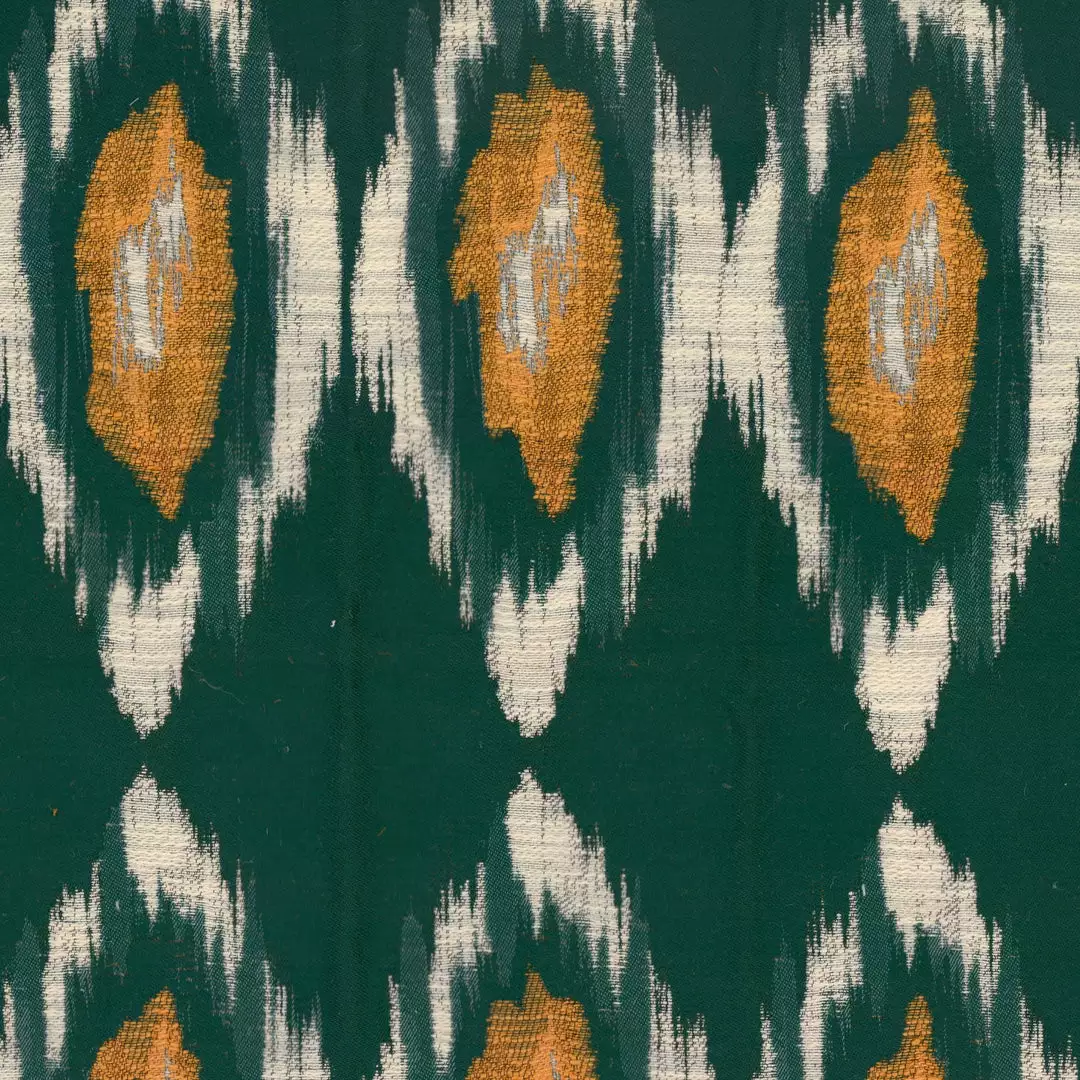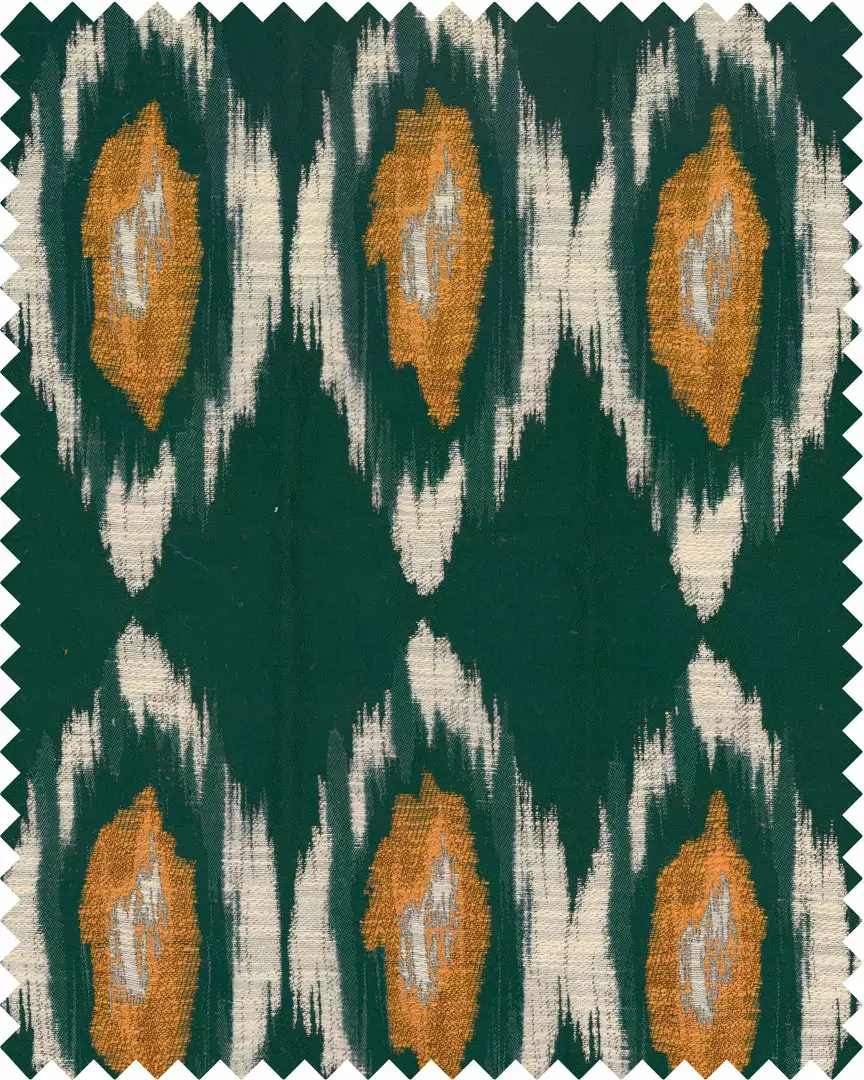 The captivating PRADESH IKAT weave presents a striking colour combination with the orange and neutral tones complementing the opulent green hue of its background. Step into its ethereal beauty almost resembling vibrant florals amongst dense green pastures, filling the imagination with fragrant aromas as your eyes are transfixed in the exquisiteness of the pattern itself.