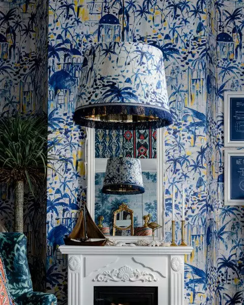 Summer vibes come through the stylish palm trees and sandy details of this charming lamp made with natural, in typical Greek blue hues. Finished with a gold metallic lining and blue fringes, the lamp comes with metallic ceiling rose, E27 lamp holder and black braided fabric cable.