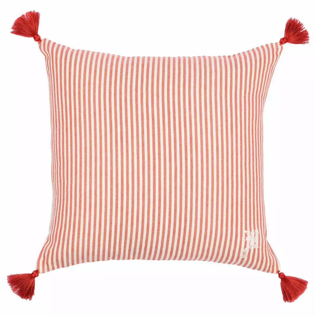 Soft lines posses full character of this elegant stripes cushion. With pattern on both sides and with ‘M’ monogram on the back. Hand finished with red cotton tassels.