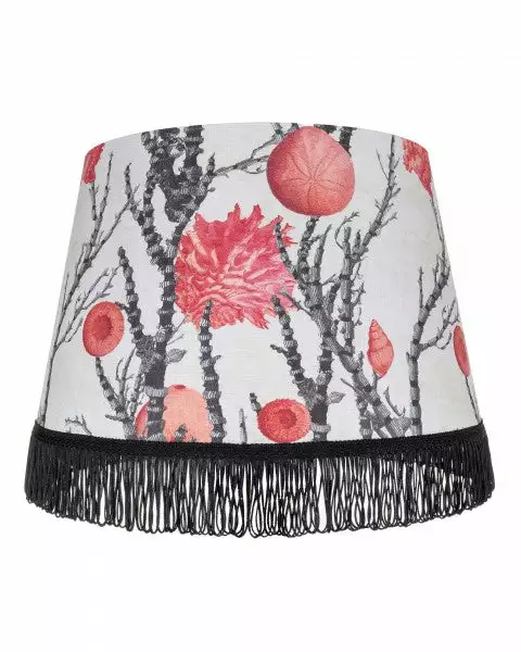 A beautiful illustrated scene of red and black corals, inviting us to the undersea world. Printed on white linen, gold metallic lining and edged with black looped fringes.Â