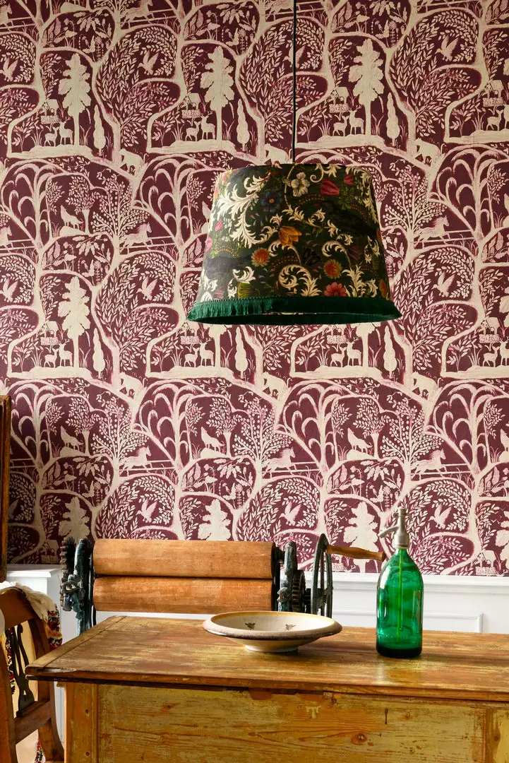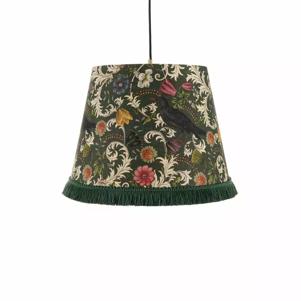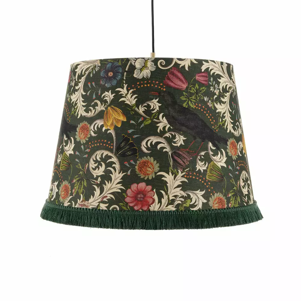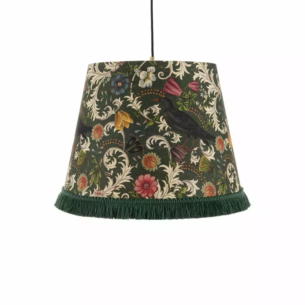 Rich Saxon vibes breeze through this printed linen cone pendant lamp, with the blackbird as a statement symbol on the top of an abundant flowery background. Finished with green fringes and golden metallic lining. Electrical fitting metal ceiling rose and E27 lamp holder in gold, 2 m black fabric cable.
