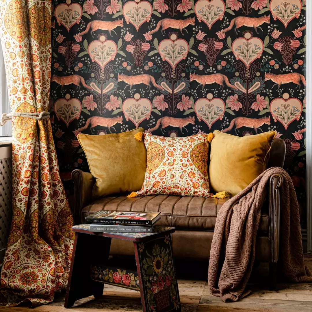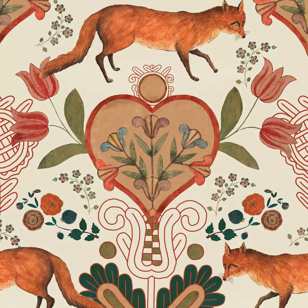 Depicting witty details of Carpathian wildlife the Vixen is emblematic of our ancestor’s hunting habits. Bold and charming the red fox stands out against a flowery décor. Available on anthracite or cream backgrounds. Folk Couture at it’s finest. Easy to put up with the paste the wall application and will add a bit of quirk to any room whether it is one wall or all. This wallpaper is digitally printed using eco-friendly inks.