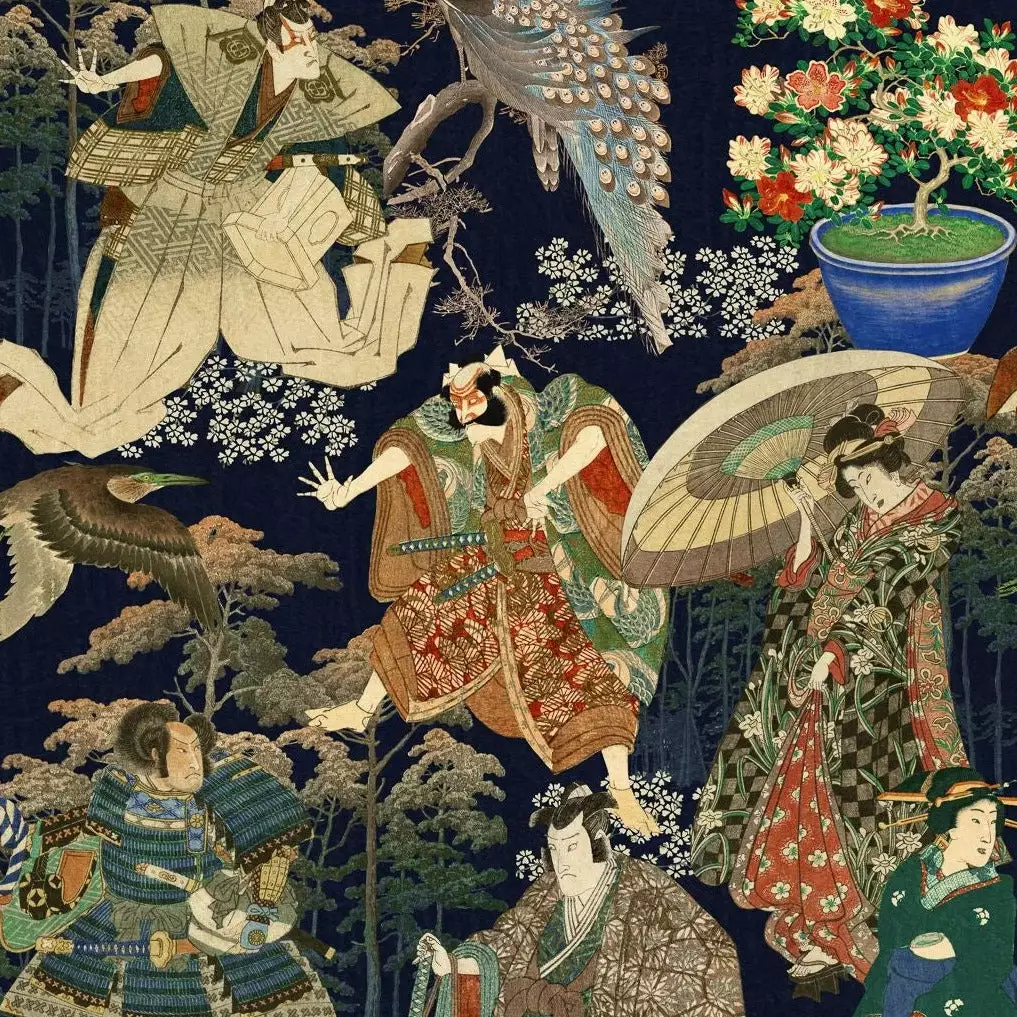 Decorate your walls with the beautiful Samurai And Geisha wallpaper from Mind The Gap. Make your walls come alive as vibrant, traditional Japanese characters emerge from within a dark forest. Each figure is adorned with rich and colourful kimonos, the flowing fabric bringing energy to the design. A vivacious statement for any home. Easy to put up with the paste the wall application and will add a bit of quirk to any room whether it is one wall or all. This wallpaper is digitally printed using eco-friendly inks. Printed across three rolls to maximise the pattern repeat.Â