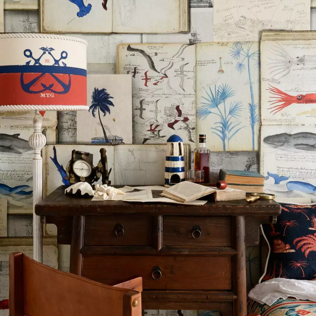 Decorate your walls with the Seaman’s Journal wallpaper from Mind The Gap. Inspired by seaside memories on board an old yacht, this design features pages of illustrations and drawings of marine life. Educational as well as beautiful. The perfect statement for any home by the sea. Available in both taupe and indigo. Easy to put up with the paste the wall application and will add a bit of quirk to any room whether it is one wall or all. This wallpaper is digitally printed using eco-friendly inks.Â
