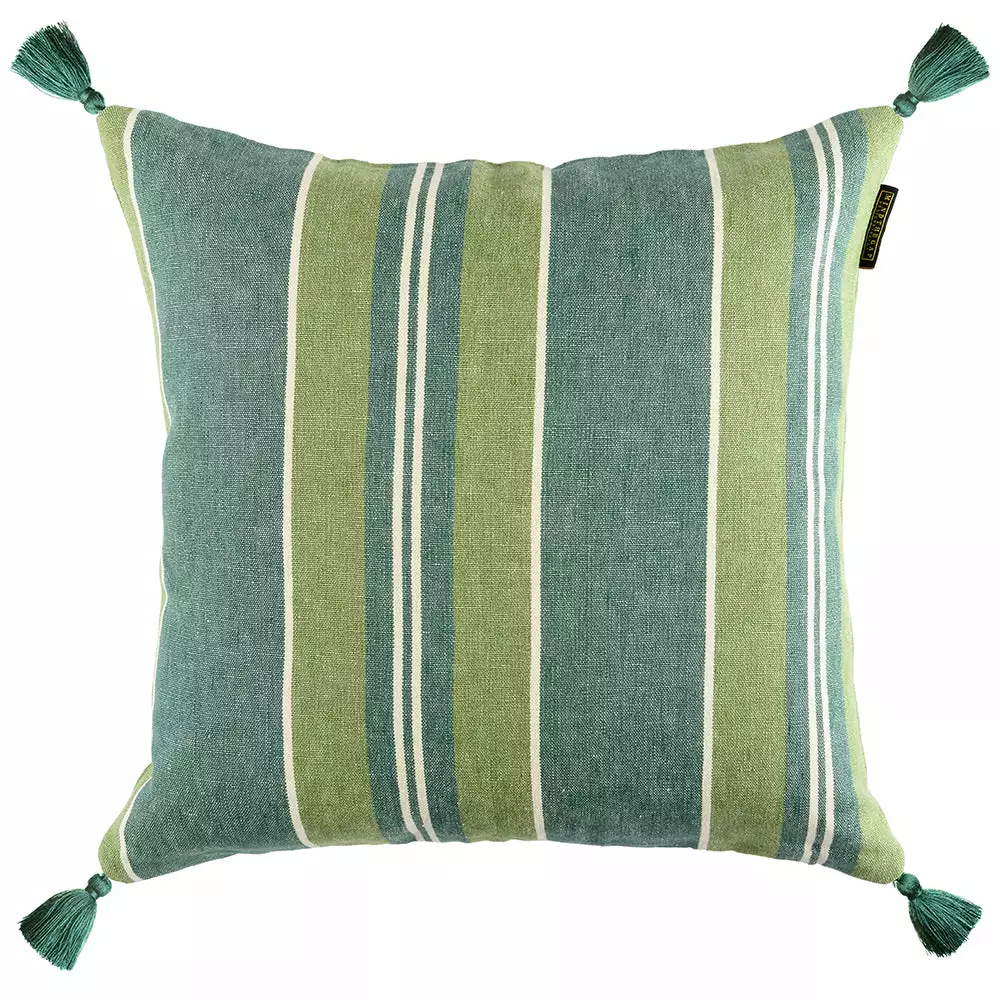 Deep Armenian roots shown in the various green shades of this striped linen cushion. Pattern on both sides and with ‘M’ monogram on the back. Hand finished with green cotton tassels.
