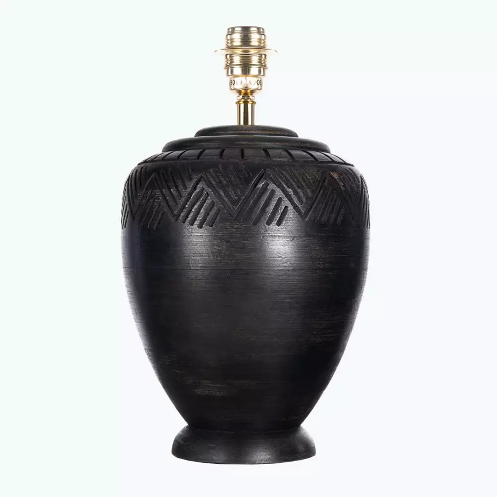 Inspired by African tribal urn shape, mango wood lamp base with antique ebony finish. Brass metal hardware. Comes with E27 metallic lamp holder and black braided cable.