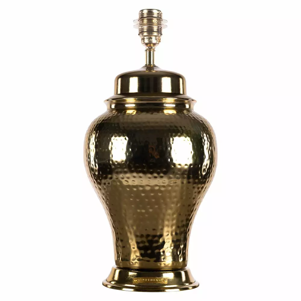 A beautiful and shapely table lamp base of hammered brass adding surface interest and texture. Metal hardware. Comes with E27 metallic lamp holder and black braided cable.