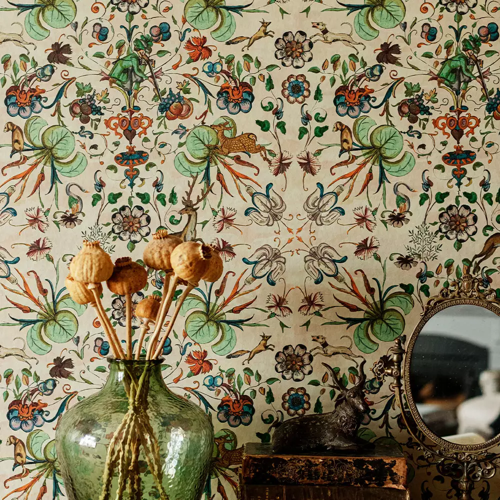 Dynamic and intricate, illustrations of botanical and wildlife motifs capture the ancestral habitat of hunting. Folk Couture at it’s finest. Easy to put up with the paste the wall application and will add a bit of quirk to any room whether it is one wall or all. This wallpaper is digitally printed using eco-friendly inks.