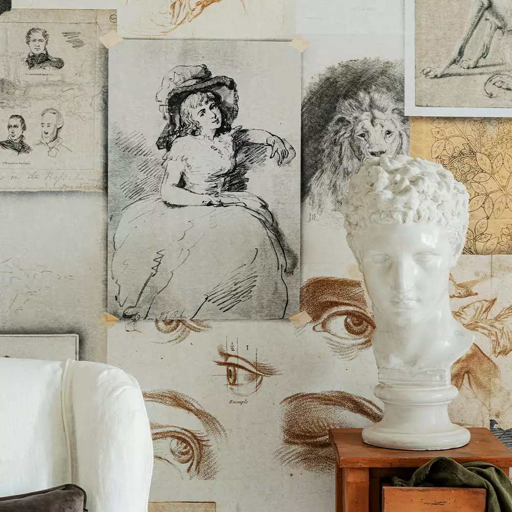 Surround yourself with beautiful drawings and illustrations with The Mood Board wallpaper from Mind The Gap. Perfect for adding daily inspiration to get your creative juices flowing, this delicate design would look beautiful in a range of spaces. Printed across three panels to maximise the pattern repeat.Â