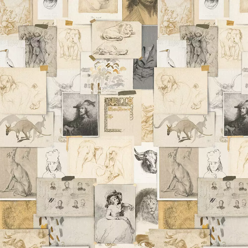 MOOD BOARD celebrates the joy in recording, collecting and displaying that which inspires and captivates you. Pinterest, be gone – here we delight in the physical act of sketching, cutting and sticking, with the pattern echoing the tactility of paper affixed to the wall. Hand drawn studies of figures, flora and fauna, details and drawing techniques are recognised for their expressive, decorative qualities and combined into a beguiling design full of life and narrative, in gentle monochromes and the sepia tones of time-aged paper and tape. The design is printed over 3 panels.
