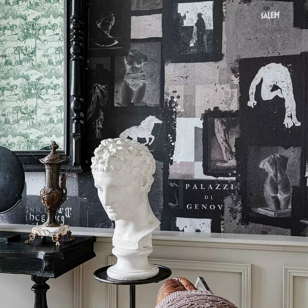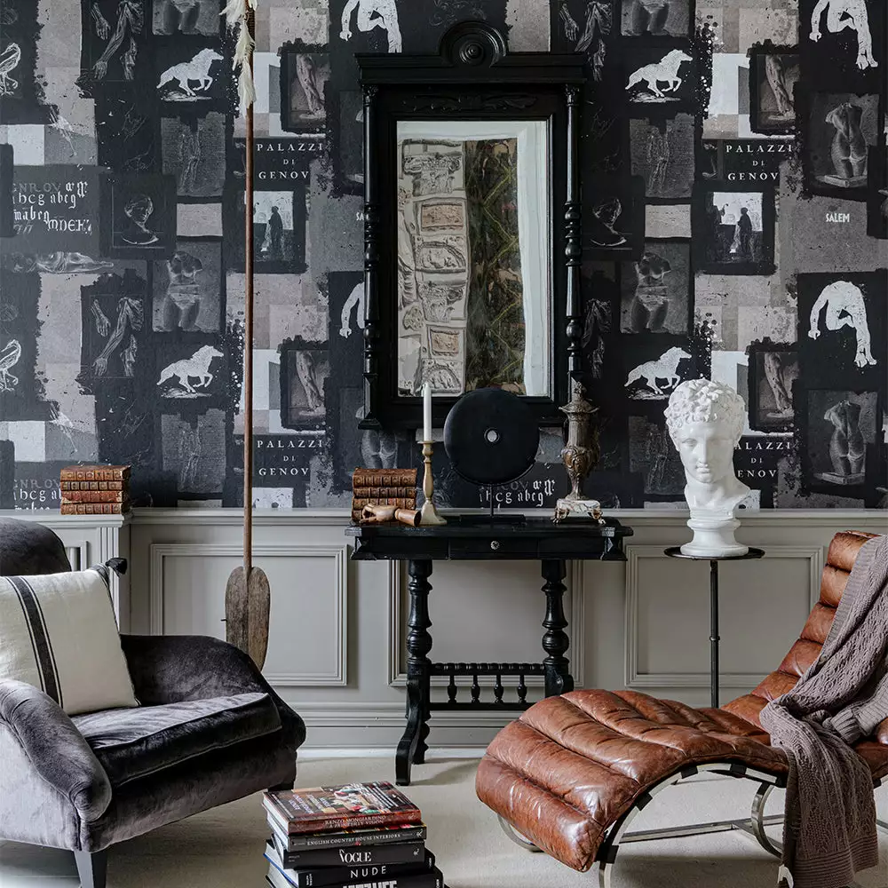 Surround yourself in the moody and atmospheric Studio wallpaper from Mind The Gap. Featuring a gathering of inspiration, the beginning of a creative concept not many get to see. A lovely monochromatic paper perfect for any home. Printed across three panels to maximise the pattern repeat. Easy to put up with the paste the wall application and will add a bit of quirk to any room whether it is one wall or all. This wallpaper is digitally printed using eco-friendly inks. Available in both dark and light colourways.Â