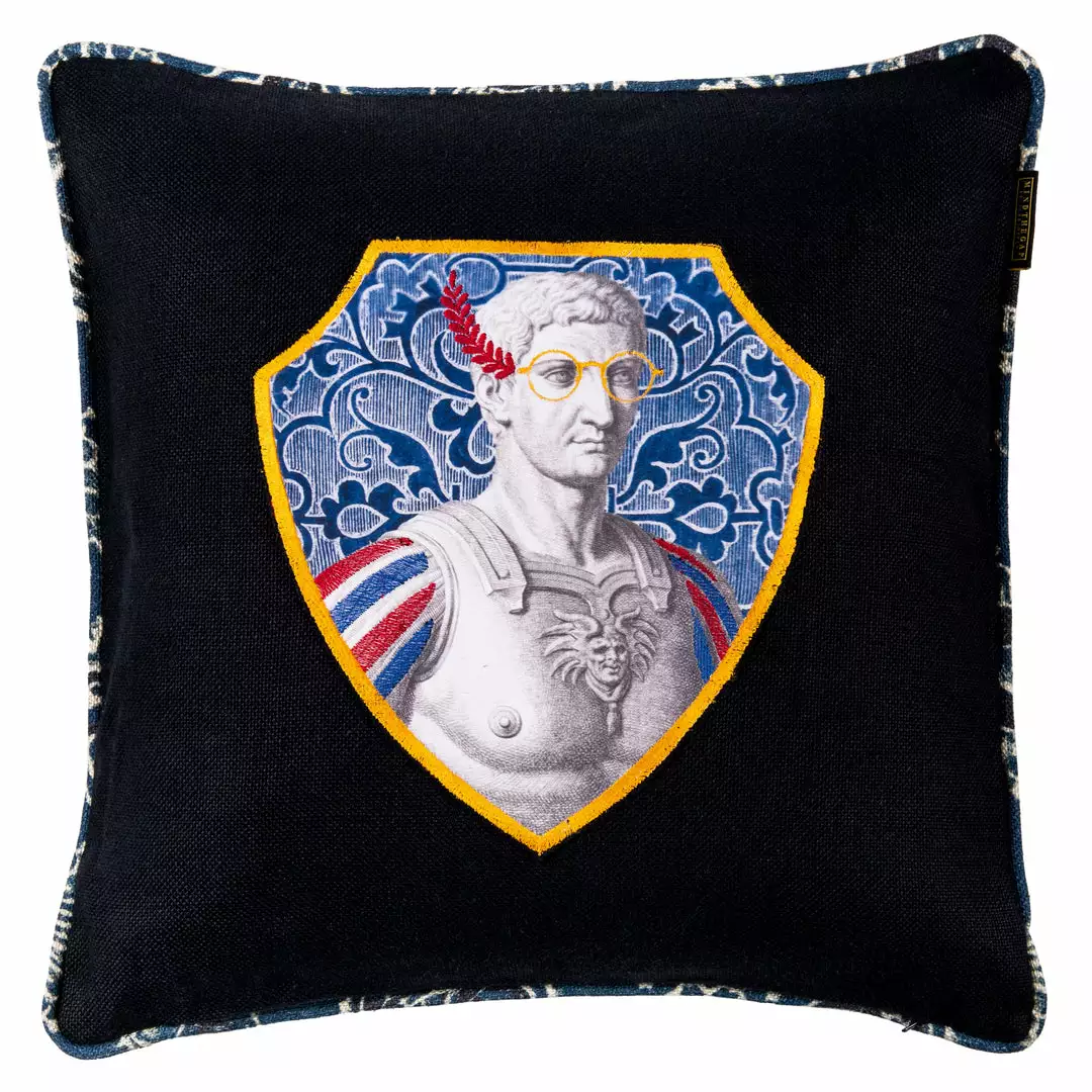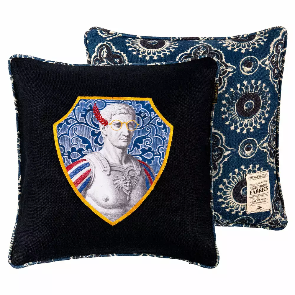 A statement designer cushion with one side made of a printed and embroidered patch with the portrait of the Roman Emperor TIBERIU , the other side AJRAKH heavy linen patterned linen, finished with assorted piping and 100% duck feather filling.  Â