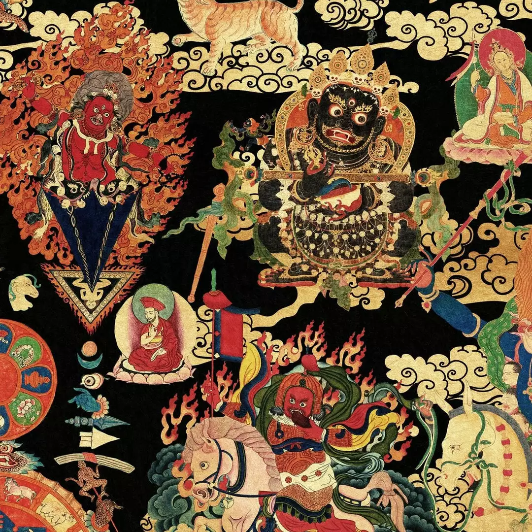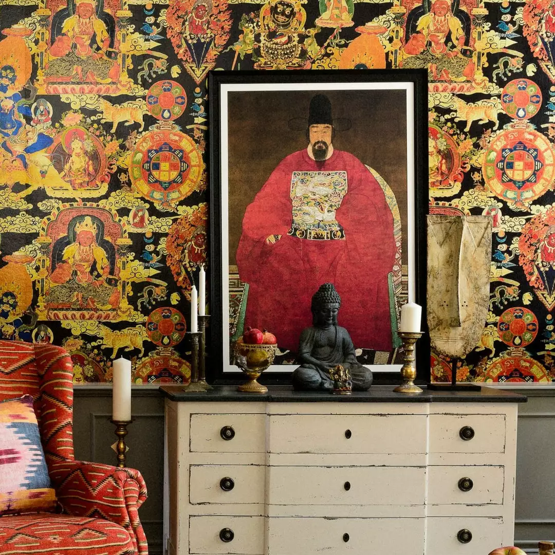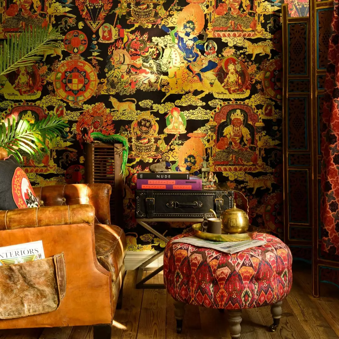 Decorate your walls with the gorgeous Tibetan Tapestry wallpaper from Mind The Gap. This wallpaper is adorned with beautiful and vibrant Tibetan motifs and will create the perfect impactful feature for any home. Easy to put up with the paste the wall application and will enhance any room whether it is one wall or all. This wallpaper is digitally printed using eco-friendly inks. Printed across three rolls to maximise the pattern repeat.Â
