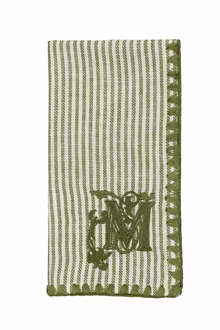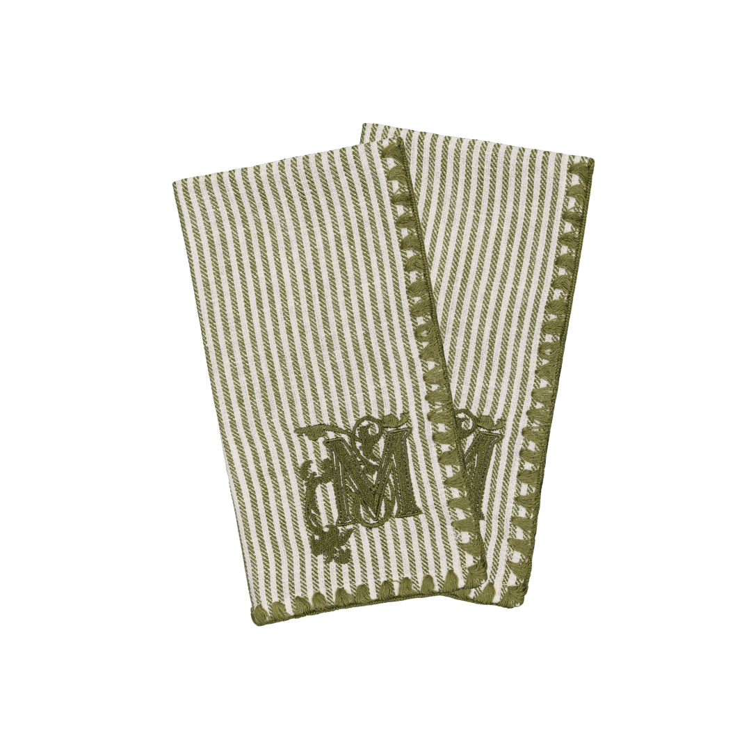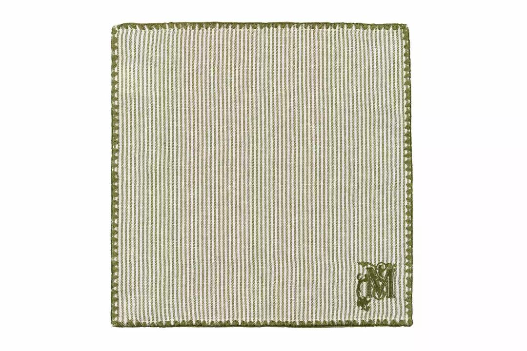 This fine linen fabric 210 gsm., carefully woven and tailored, benefits of a soft-washing treatment to obtain a delicate touch. The stonewashed napkin is edged in characterful light green scallop crochet, showcasing our leafy woven M logo which acts as a statement finish to this precious item.