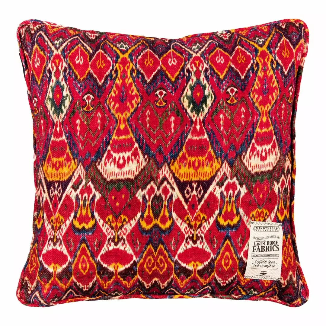 A multicolour design inspired by the tradition of handwoven Uzbekistan ikat silks with their bold colours and Nomadic patterns. Rich in reds and jewel tones, finished with assorted piping and 100% duck feather filling. Â Â