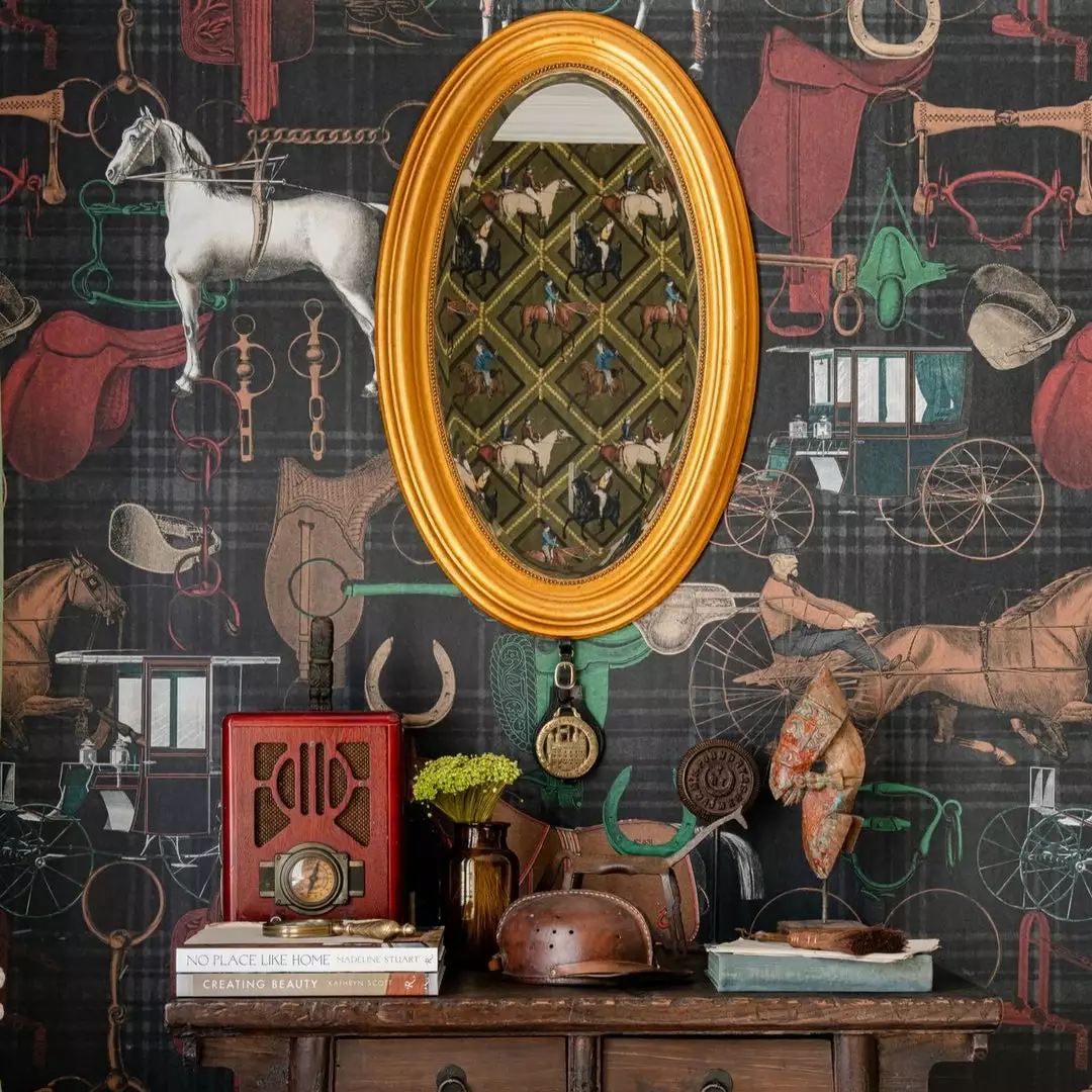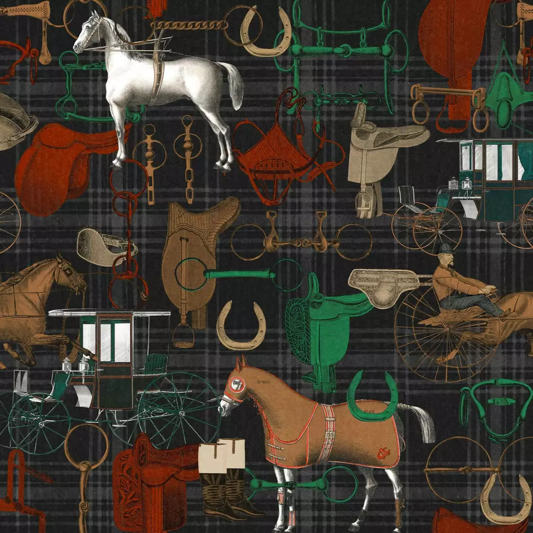 Surround yourself with the impactful The Jockey wallpaper from Mind The Gap. Perfect for all lovers of horses, this design features a range of beautifully illustrated objects from boots and bridles to carriages and horse shoes to create a rich and vibrant statement in any home. Available in both multicoloured and faded colourways. Easy to put up with the paste the wall application and will add a bit of quirk to any room whether it is one wall or all. This wallpaper is digitally printed using eco-friendly inks.