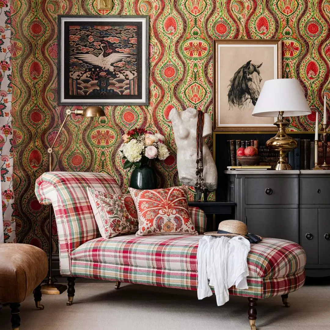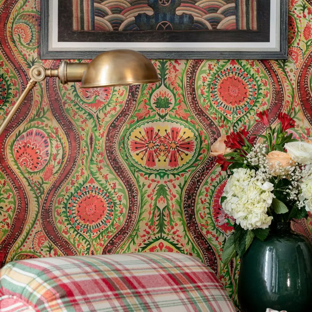 Wander back to the Summer of Love in the late 1960s when paisley became the symbol of psychedelic fashion. Worn by dreamers, idealists, romantics, and those who fought for freedom, this swirling pattern takes you on a vivid journey filled with intense colour and dazzling floral forms. Evoking the era perfectly, the HIPPIE PAISLEY print envelops you in the beauty of bohemian glamour with pastel greens and yellows contrasting the flamboyant motifs of pink and red.