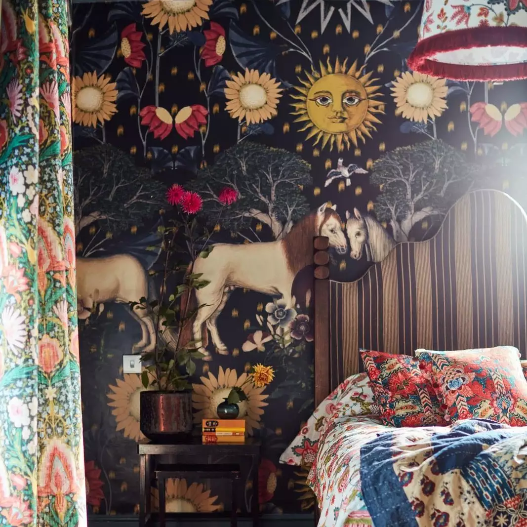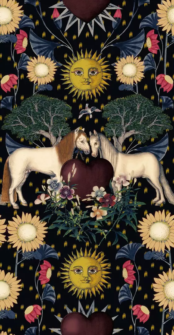 Meander through golden fields of sunflowers while wild horses graze under the shadow of woodland nearby. Symbolic hearts radiate a sense of comfort and peace as you lose yourself in the whimsical meadows which surround you with tranquility. The sun warms your skin as you listen to the sound of birds flying above you. Evoking sounds and smells of long summer afternoons, the MIRAGE wallpaper, set on two contrasting backdrops, brings a restful ambience into the room.Â